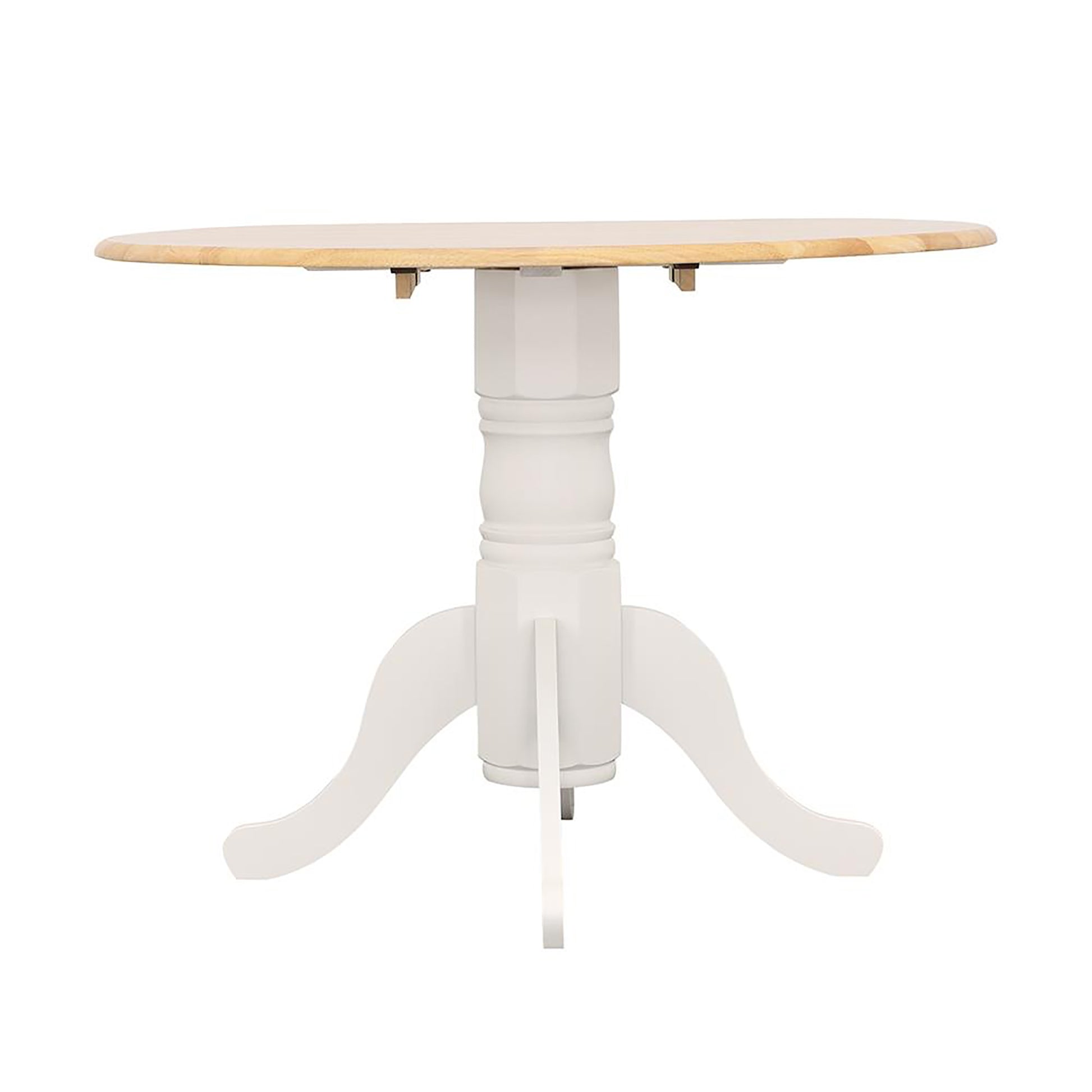 Enhance your dining space with the Natural Brown and White Round Dining Table with Drop Leaf. Made in Malaysia, this wood table showcases a light brown wood tone and a clean, natural finish that complements both everyday meals and special gatherings. The round shape invites conversation and the farmhouse rustic vibes add timeless appeal to your dining room or kitchen.