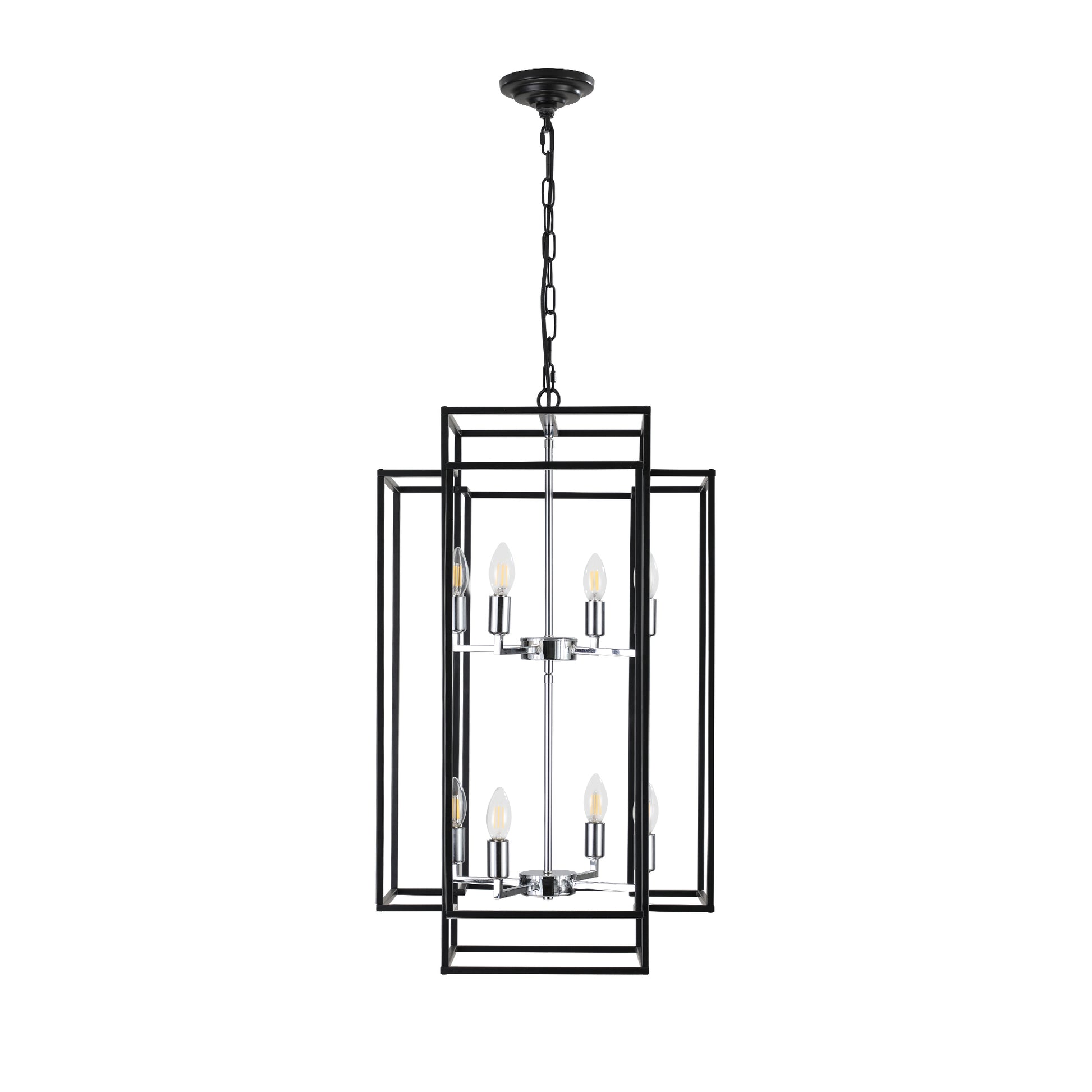 Elevate your space with a bold, architectural statement. This 8-light lantern pendant blends industrial edge with farmhouse warmth, making it a perfect centerpiece for entryways, dining rooms, living spaces, or over a kitchen island. Its black matte metal frame pairs beautifully with a chrome central lamp base for a striking black and silver look.