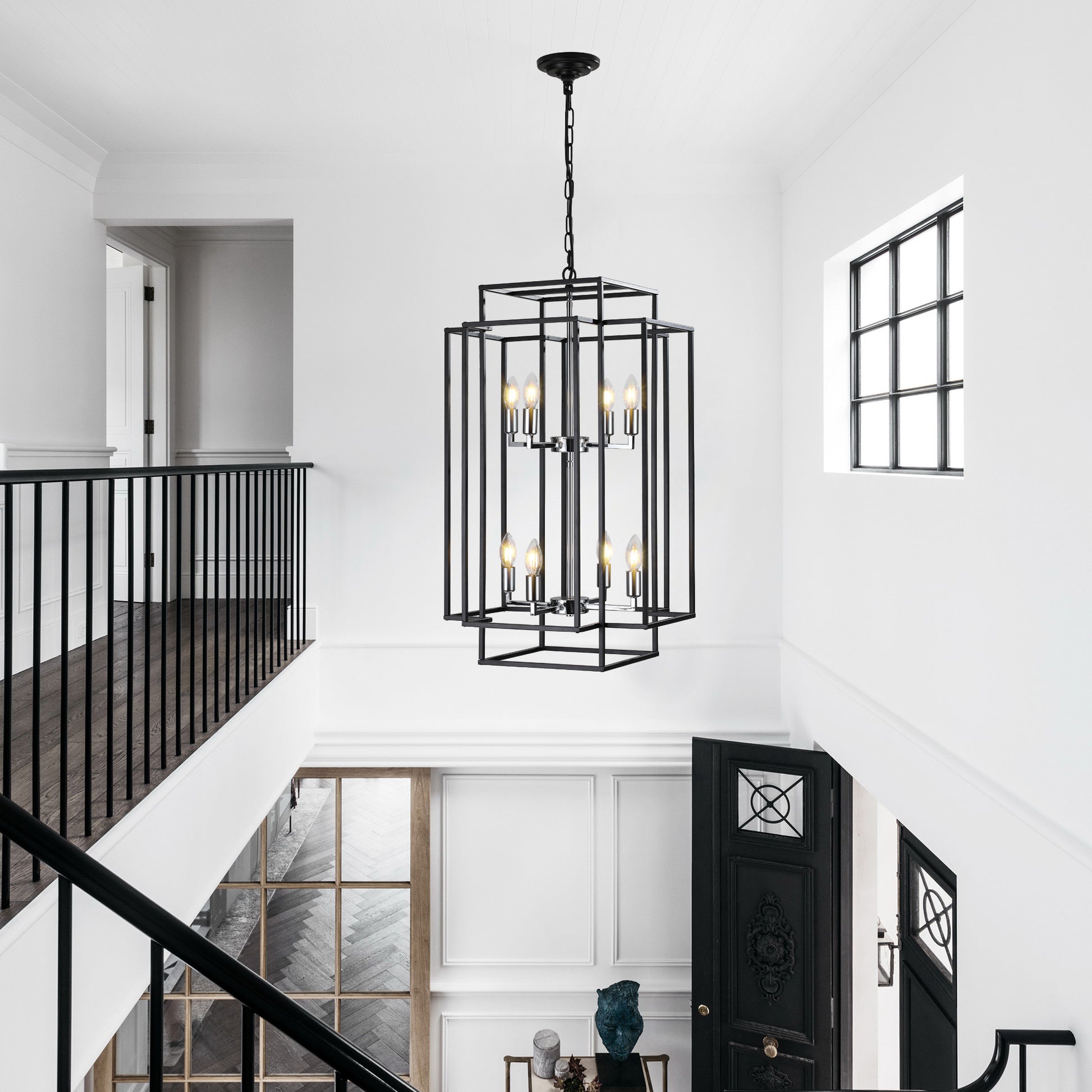 8-Light Lantern Pendant Light — Industrial Farmhouse Chandelier for Entryway & Kitchen Island (Black Matte & Chrome)