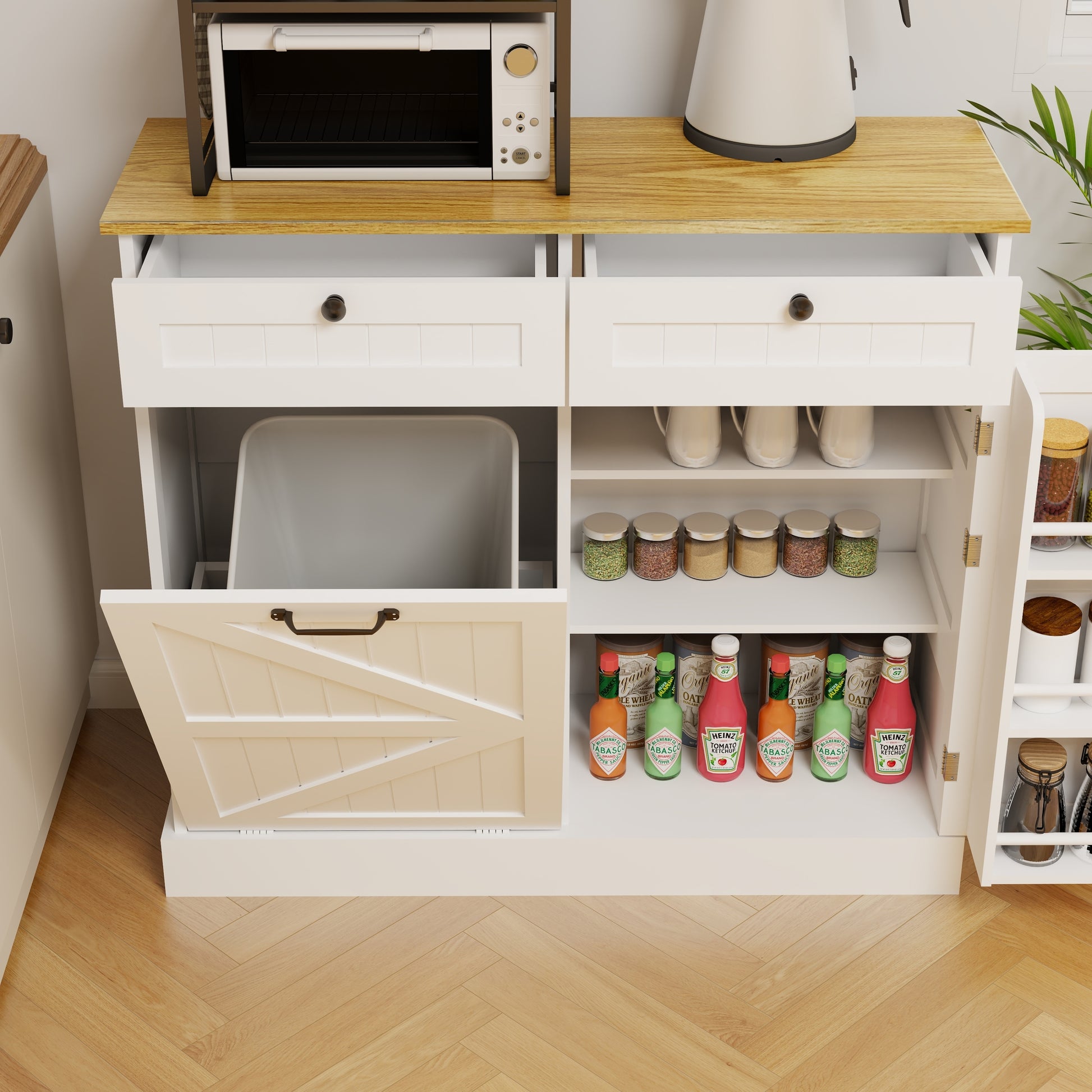 - Ample Storage Space: Equipped with a wide tabletop, this cabinet can hold small appliances, while two drawers provide convenient storage for utensils and tableware. A dedicated garbage cabinet discreetly hides your trash, complete with a tilt-out feature.