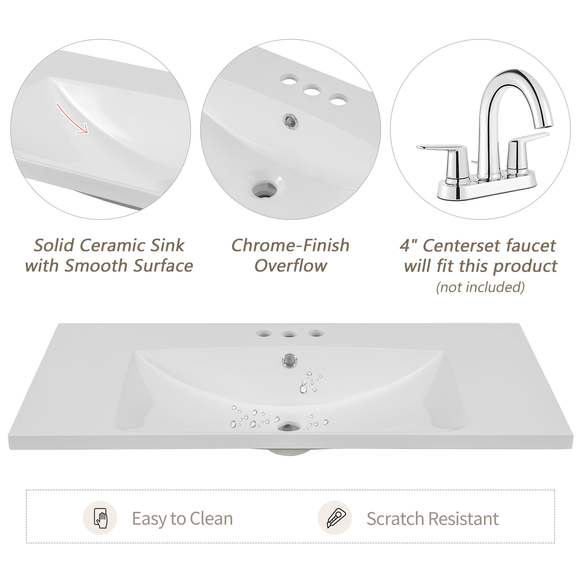 - Durable Ceramic Sink: Featuring a smooth, waterproof finish, the solid ceramic sink resists water stains and includes pre-drilled holes for a 4" centerset faucet (not included). The overflow feature ensures peace of mind, preventing accidental spills.