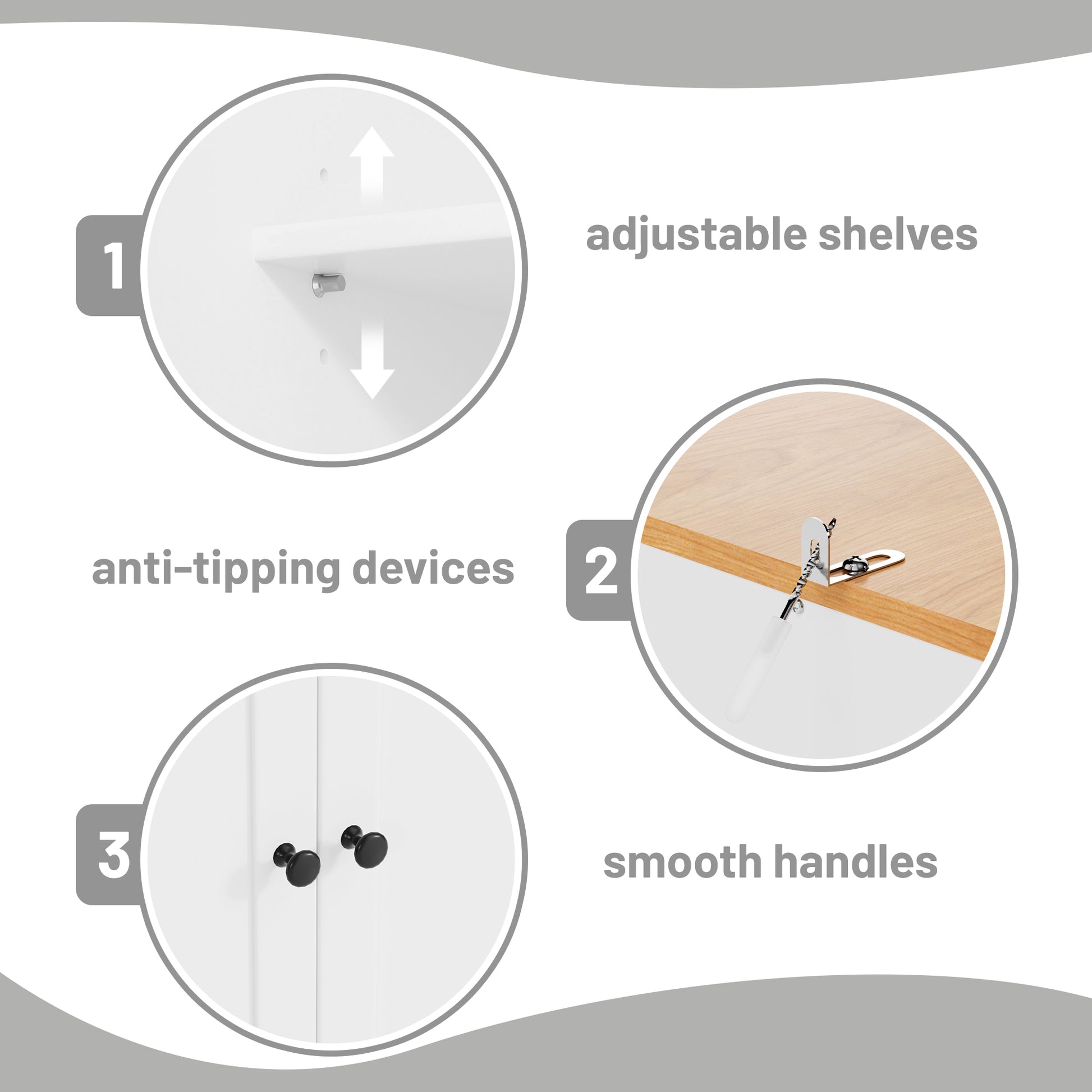 - Adjustable Shelves: Two adjustable shelves can be positioned at three different heights, allowing for a customized storage solution tailored to your needs.