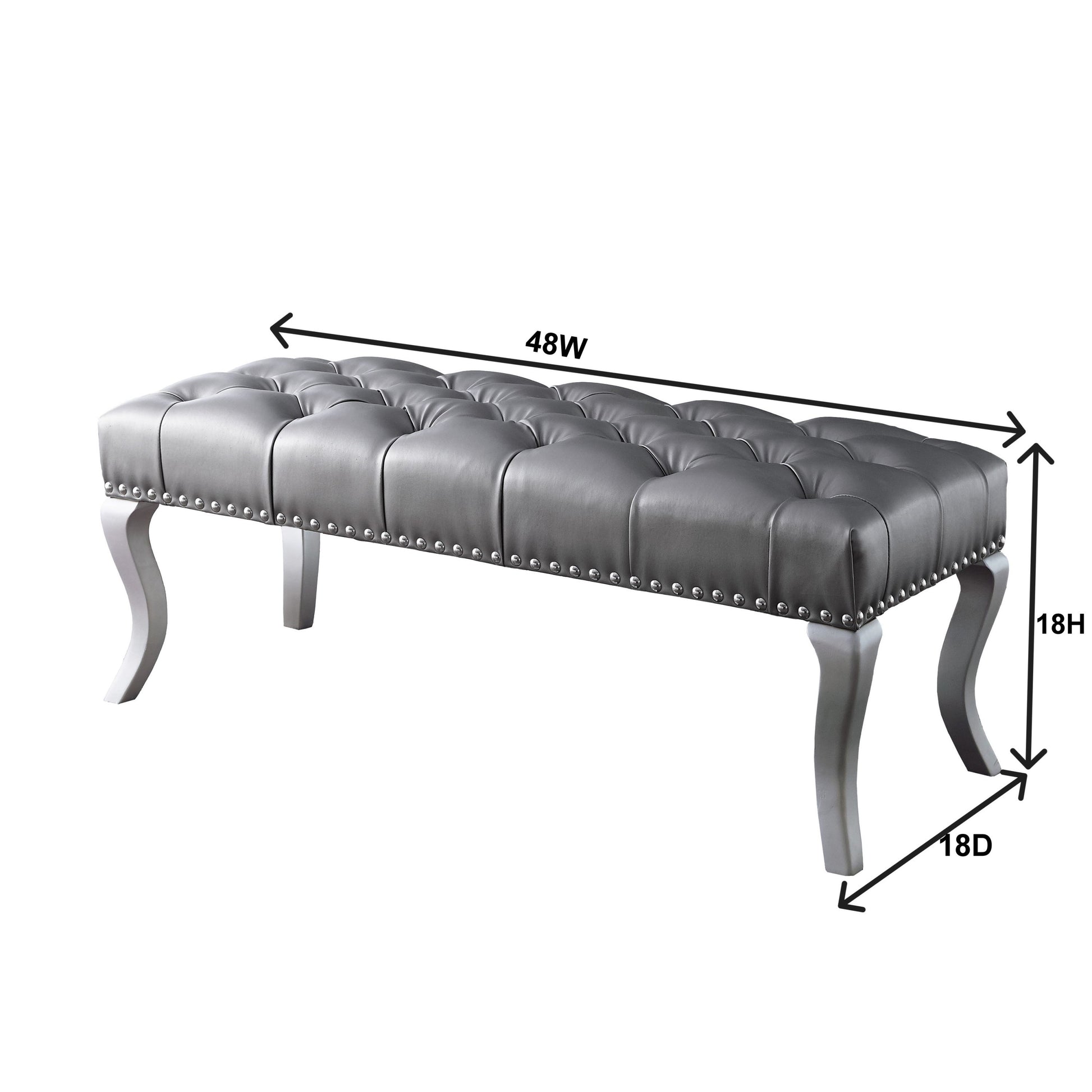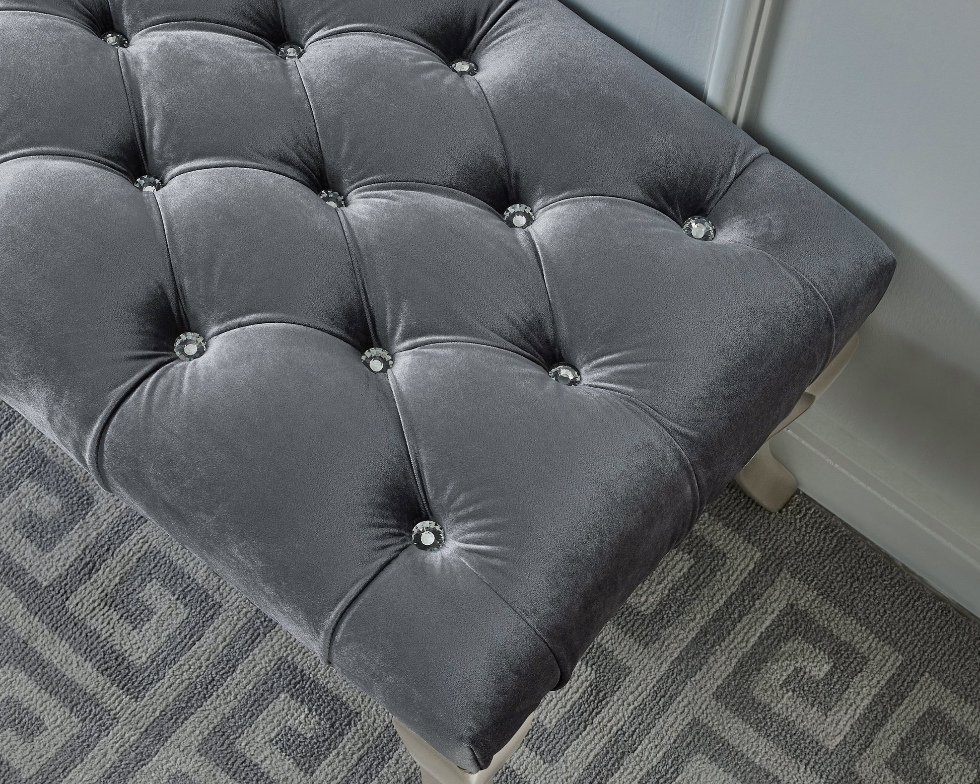 Step into contemporary elegance with this tufted upholstered bench. Covered in soft gray velvet, it offers a generous seating surface that elevates living rooms, bedrooms, or entryways with refined glam. Faux crystal button tufting adds a subtle touch of luxury, while the nailhead trim along the edge highlights craftsmanship and detail.