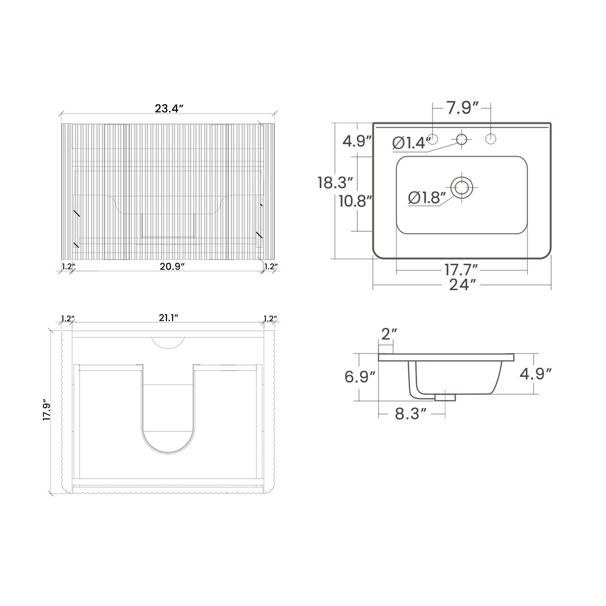 24" Modern Floating Bathroom Vanity with White Ceramic Sink and Striped Walnut Finish, Pre-Assembled Wall-Mounted Design