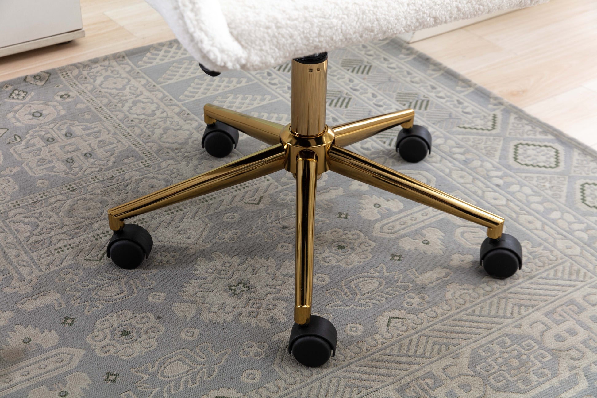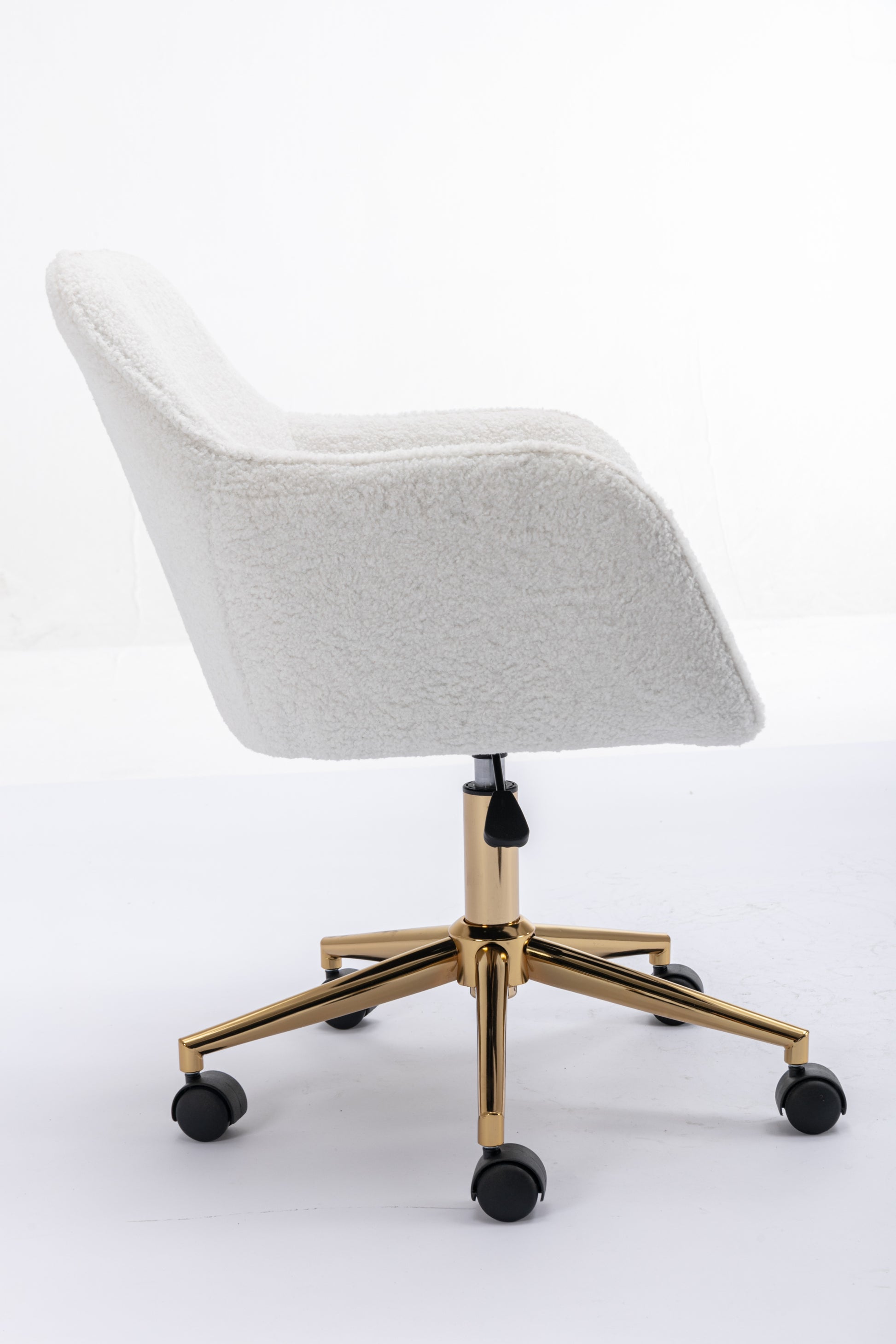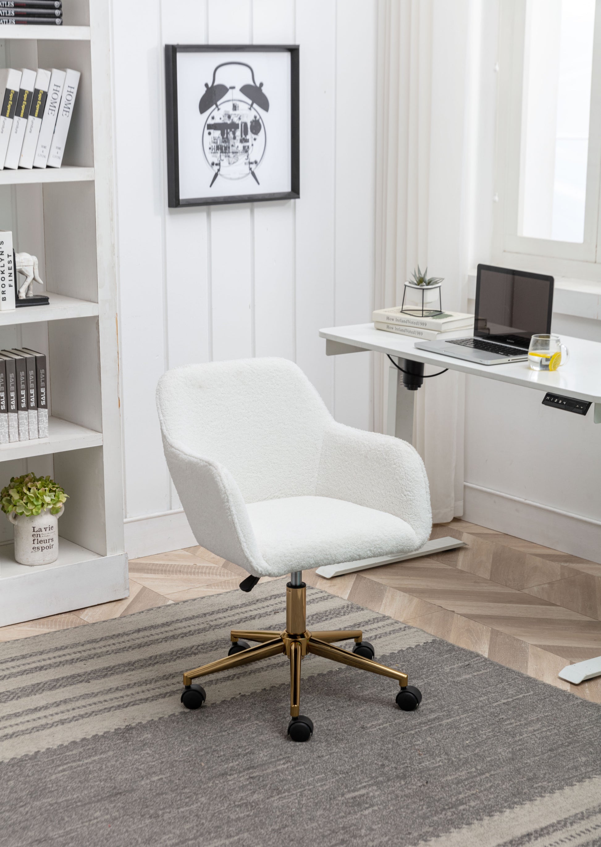 Elegant White Teddy Fabric Home Office Chair with Gold Metal Legs and 360° Swivel Function