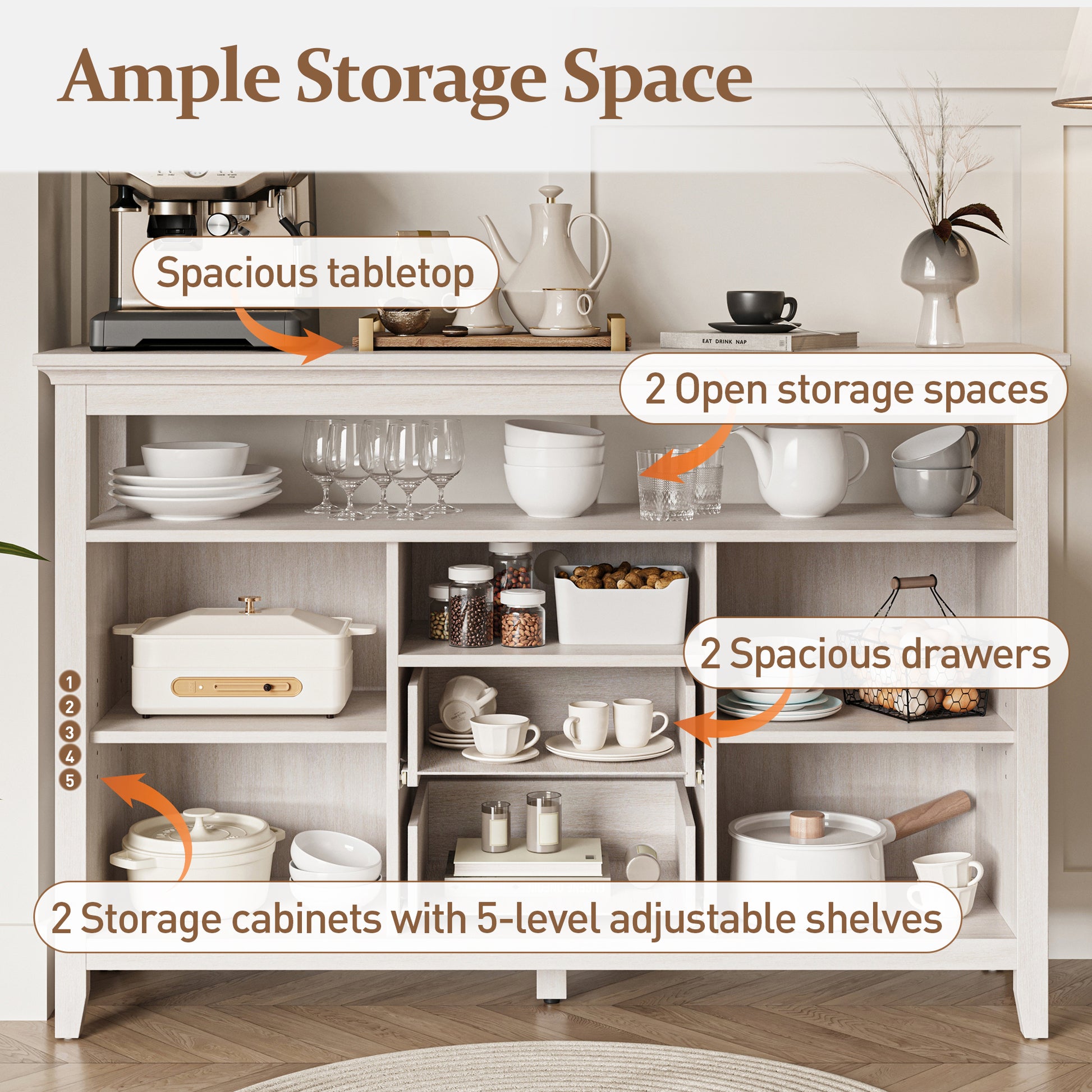 The cabinet design combines open and closed storage with 2 smooth-slide drawers and 2 cabinets featuring 5 adjustable shelves. Tailor the interior to accommodate tall bottles, stacks of dishes, or electronics, all while maintaining a clean, organized look.