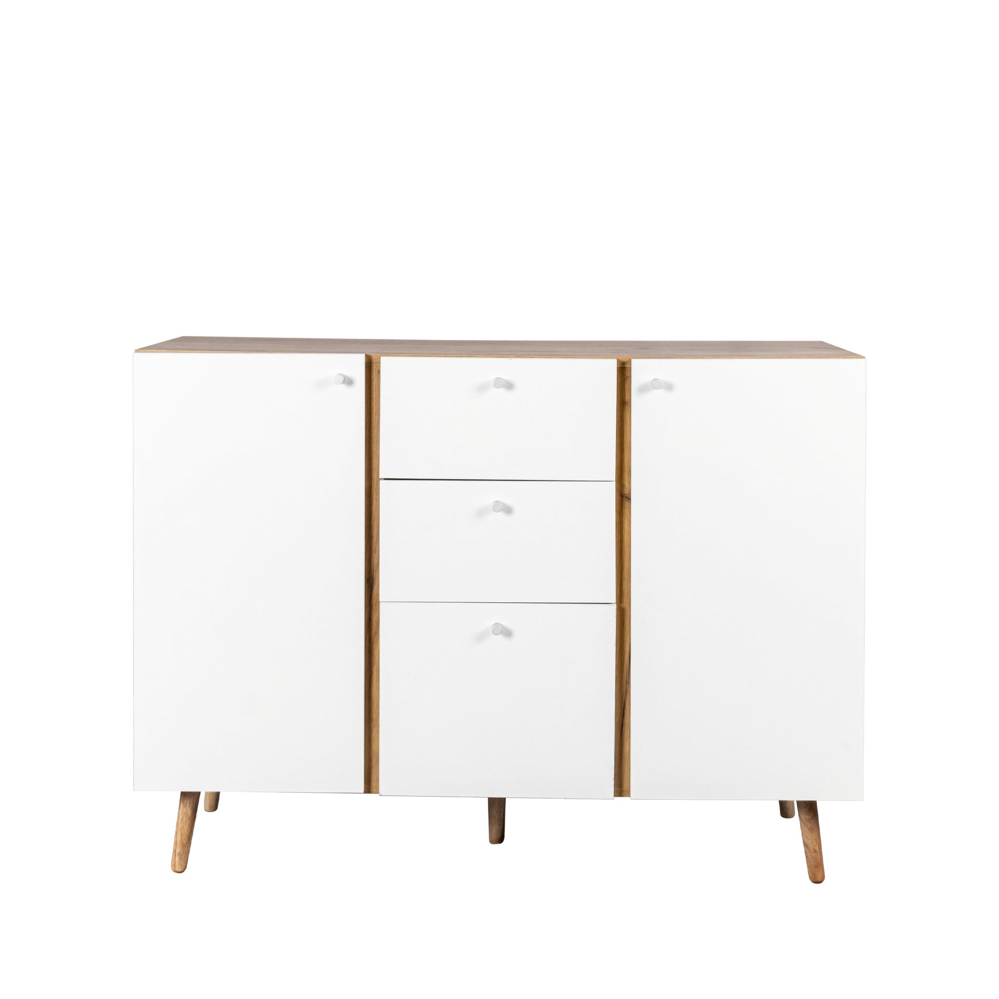 The cabinet features a subtle fluted texture that adds depth and visual interest, while sleek metal handles offer an ergonomic grip and contemporary flair. Crafted from durable particle board + MDF and finished in a crisp white, this sideboard is built to withstand daily use and stand the test of time. The unit supports up to 70 lbs of weight, ensuring stable storage for your essentials.