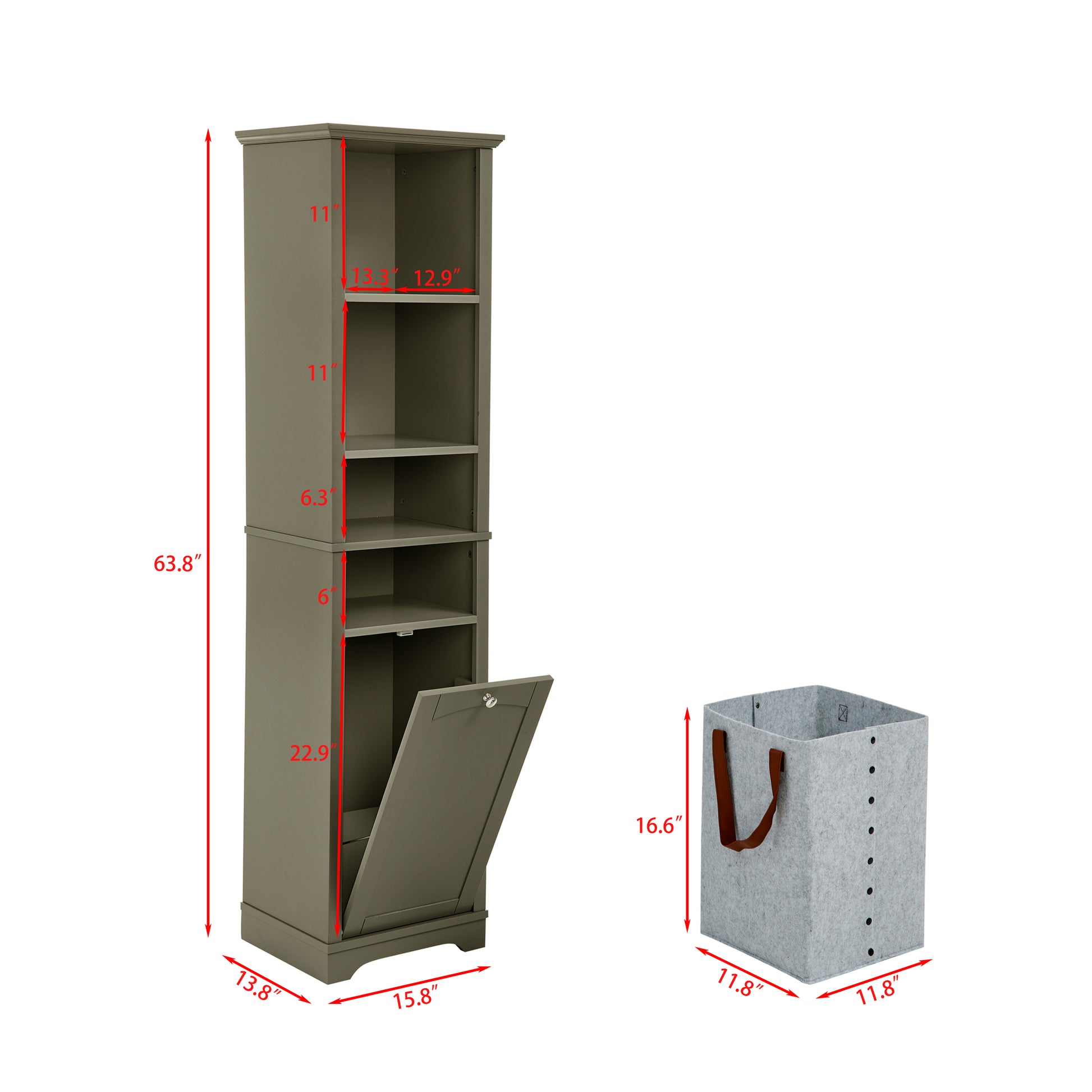64-Inch Slim Bathroom Storage Cabinet with Adjustable Shelves and Hidden Laundry Hamper, Grey Finish for Small Spaces