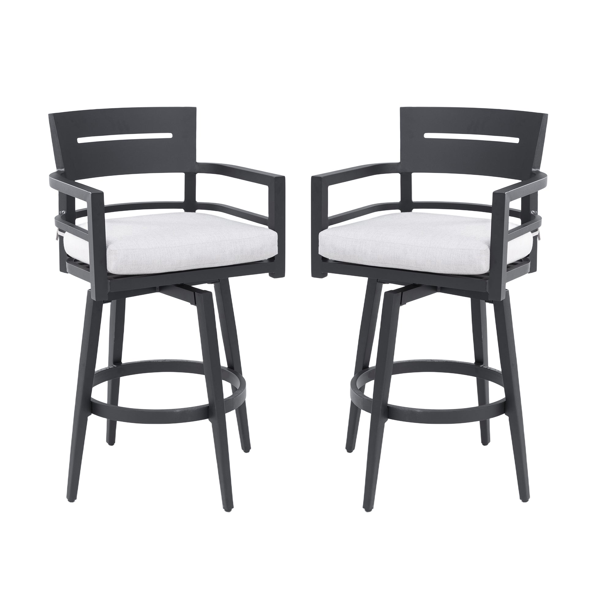 Transform your outdoor living space with a two-piece set of Outdoor Swivel Bar Chairs. Crafted from premium aluminum with an Ember Black powder-coated finish, these chairs resist rust, withstand the elements, and clean easily. The ergonomic backrest, seamless armrest connection, and built-in footrest deliver all-day comfort for conversations on patios, bar islands, or poolside lounges.
