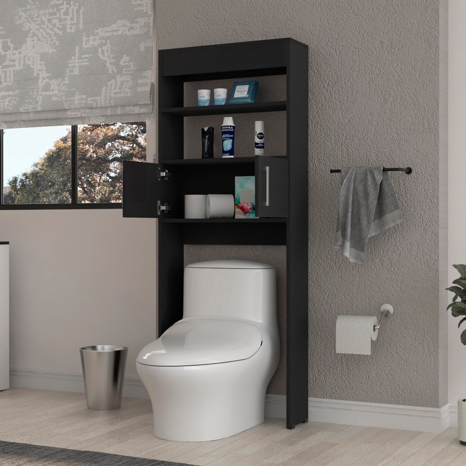 Modern Black Over-the-Toilet Storage Cabinet with Double Doors and Three Shelves