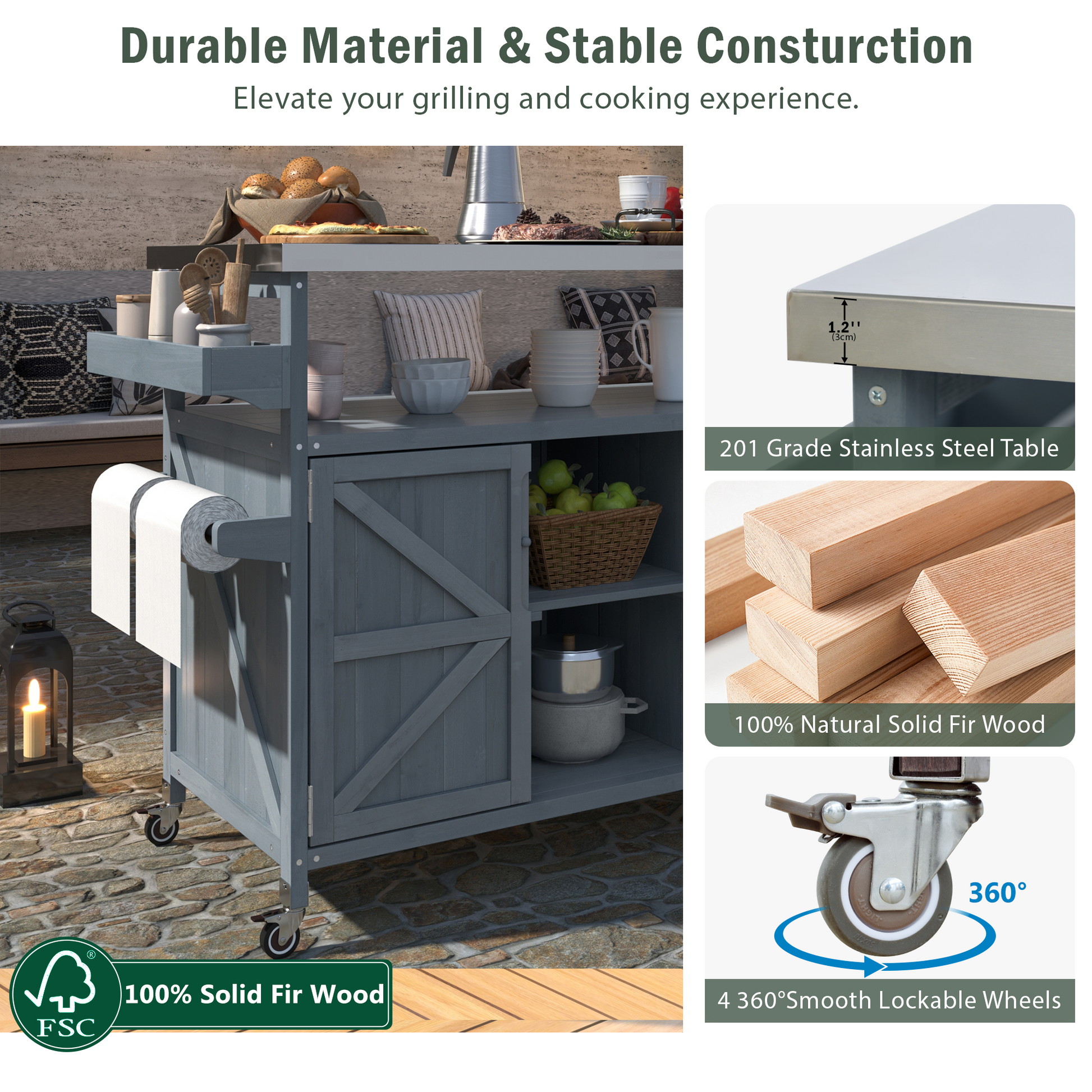 Rolling Outdoor Kitchen Island with Stainless Steel Top, Grey Blue Fir Wood Bar Cart & Storage Cabinet for BBQ and Garden Parties