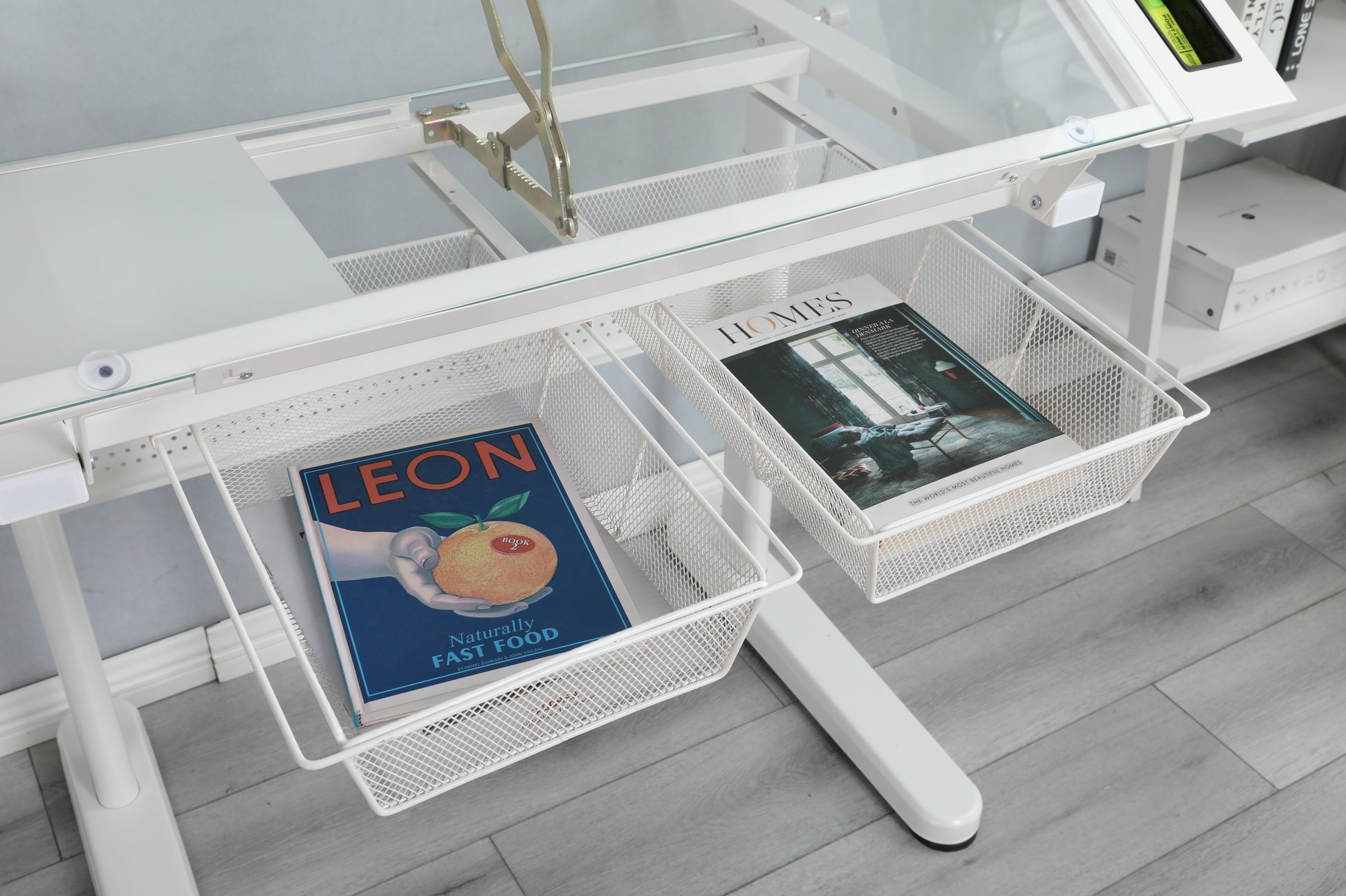 Elevate your creativity and productivity with our Adjustable Hand Crank Drafting Table, which comes complete with a comfortable stool and dual metal drawers. Perfect for artists, designers, and anyone who values a functional yet stylish workspace.