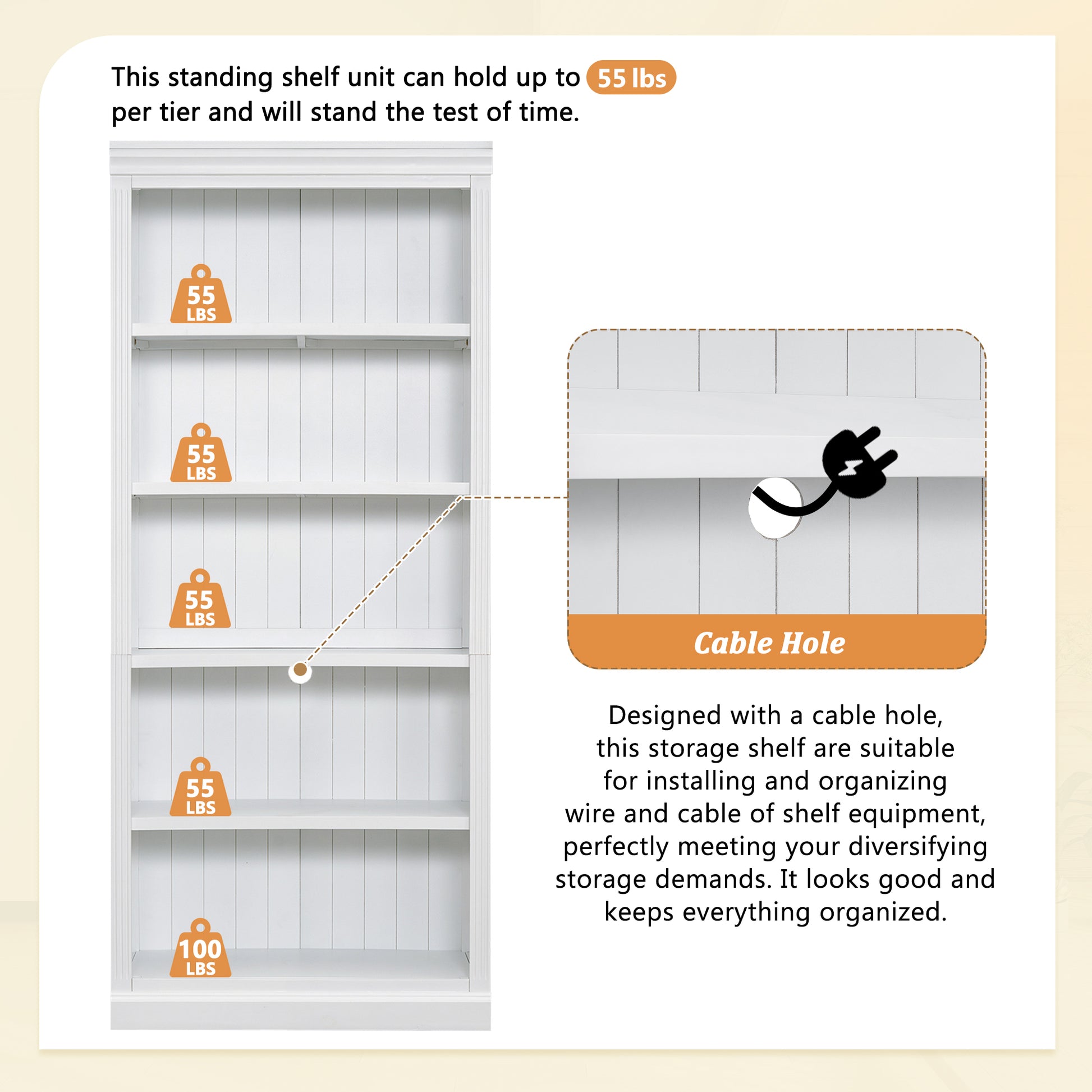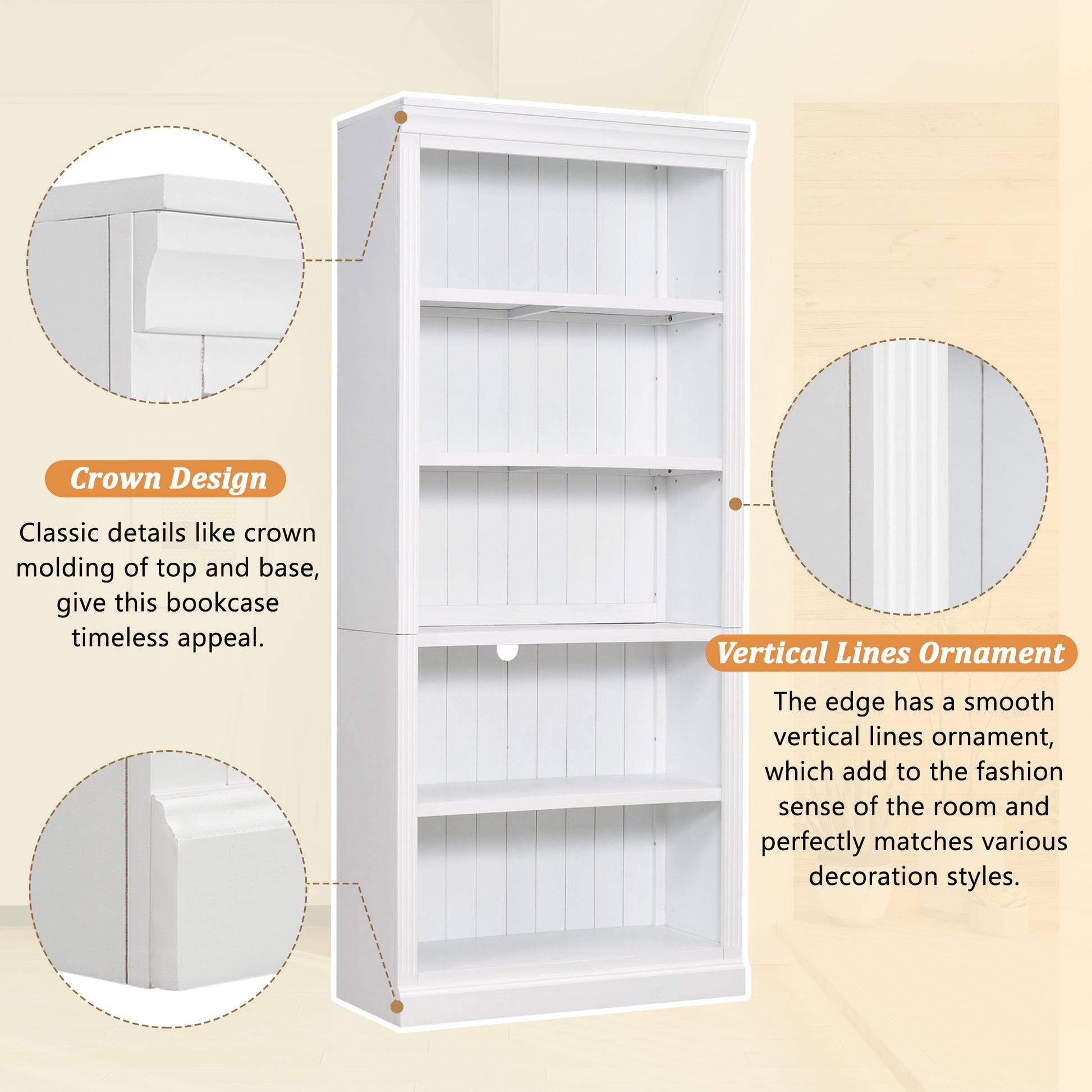 Modern 5-Tier White Wooden Bookcase with Adjustable Shelves for Home and Office Storage