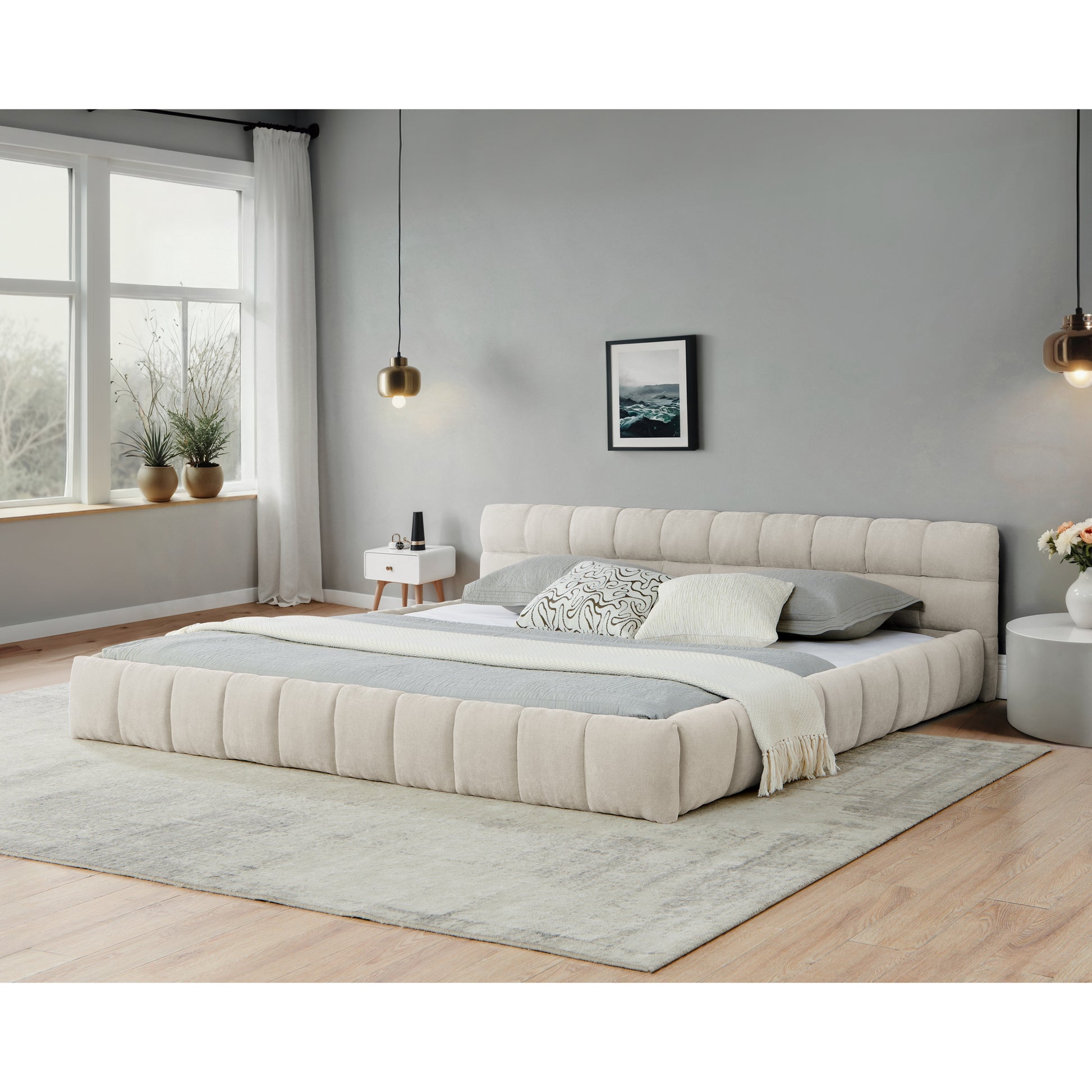 California King Platform Bed Frame with Thick Chenille Upholstery and Headboard, No Box Spring, Beige