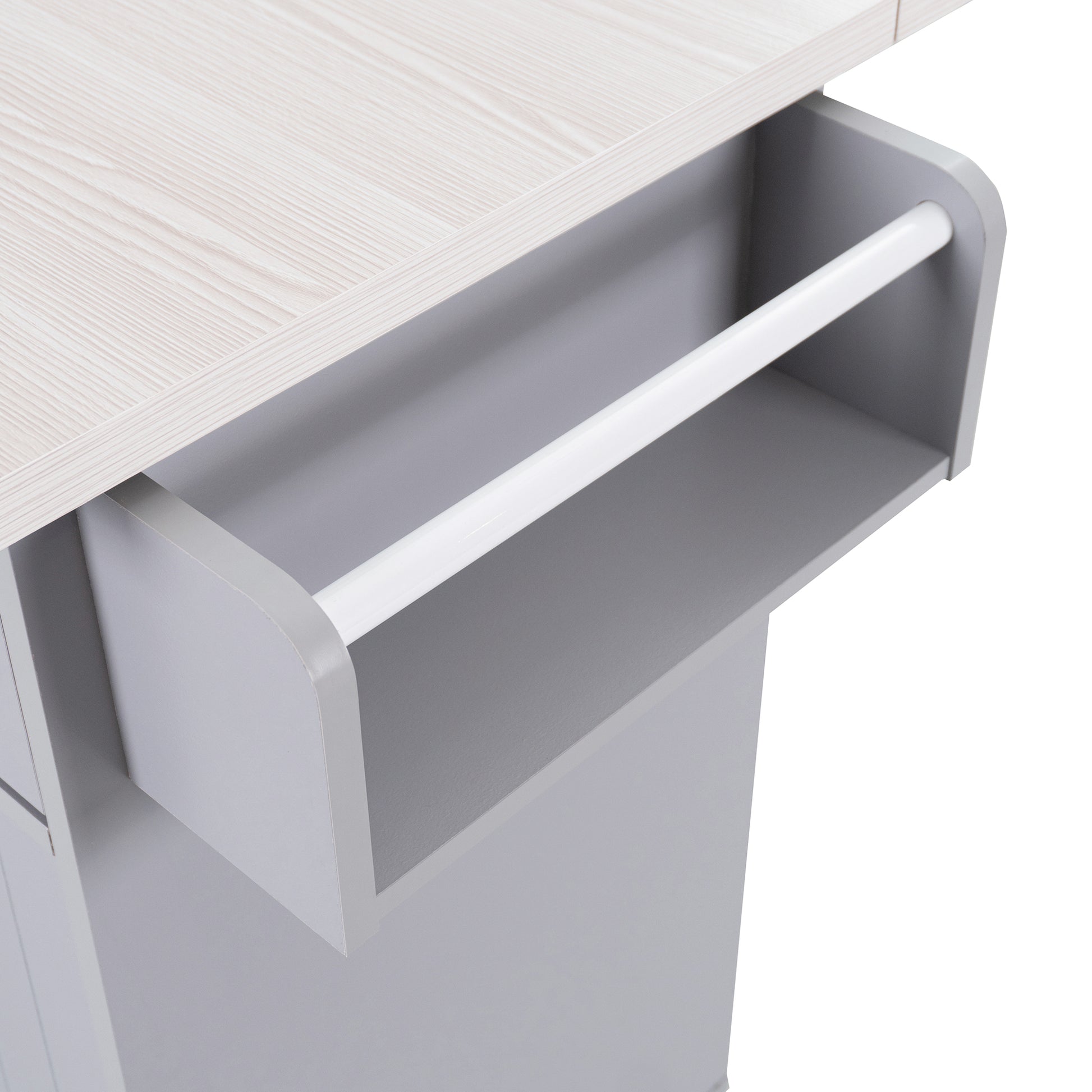 Elevate your culinary space with the Grey Rolling Kitchen Island, designed to combine functionality with style. This versatile kitchen island features a drop leaf, ample storage solutions, and a convenient trash can compartment, making it the perfect addition to any kitchen.
