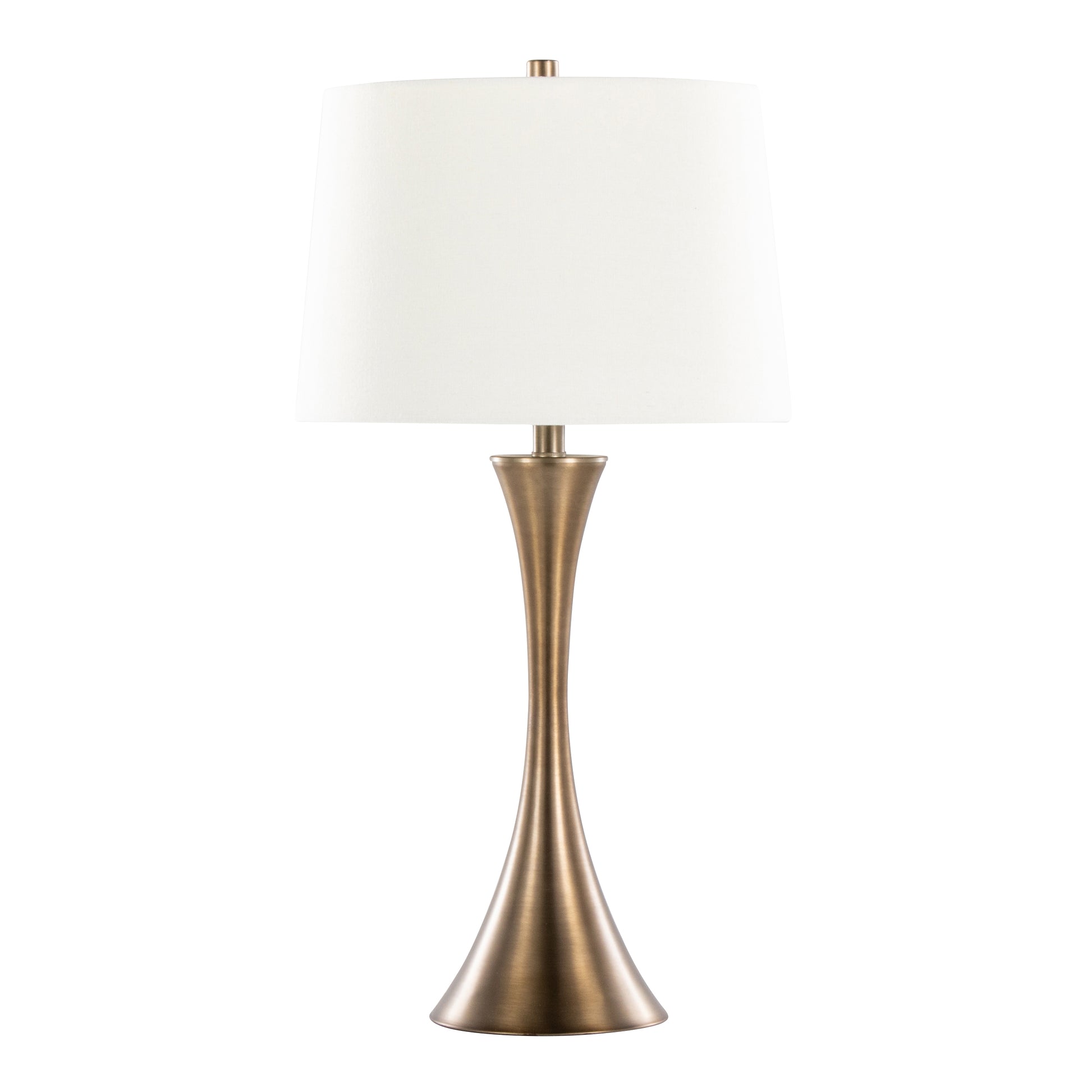 Upgrade your space with a stylish pair of table lamps from Grandview Gallery by LumiSource. Each lamp features a round base that gracefully curves into an hourglass silhouette, finished in a sophisticated matte golden bronze. The off-white linen drum shade softens brightness and adds a touch of refined texture to your room, creating a versatile lighting solution for any setting.