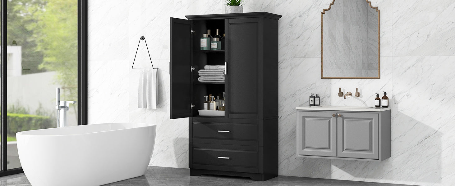 Black Tall Storage Cabinet with Adjustable Shelves, Doors, and Drawers - MDF Construction