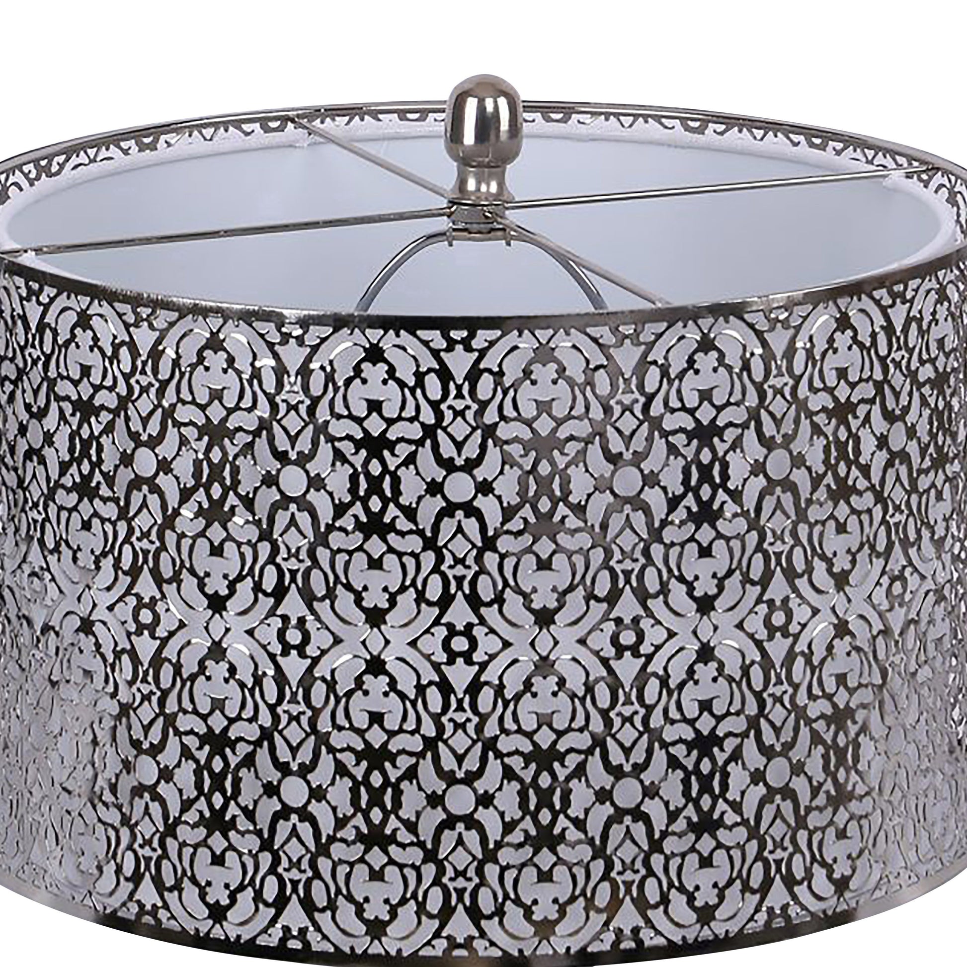 Elevate your space with a contemporary floor lamp that blends sculptural metalwork with glamorous detailing. Standing 63 inches tall, this lamp showcases laser-cut metal accents and a polished nickel finish that catches the light from every angle.
