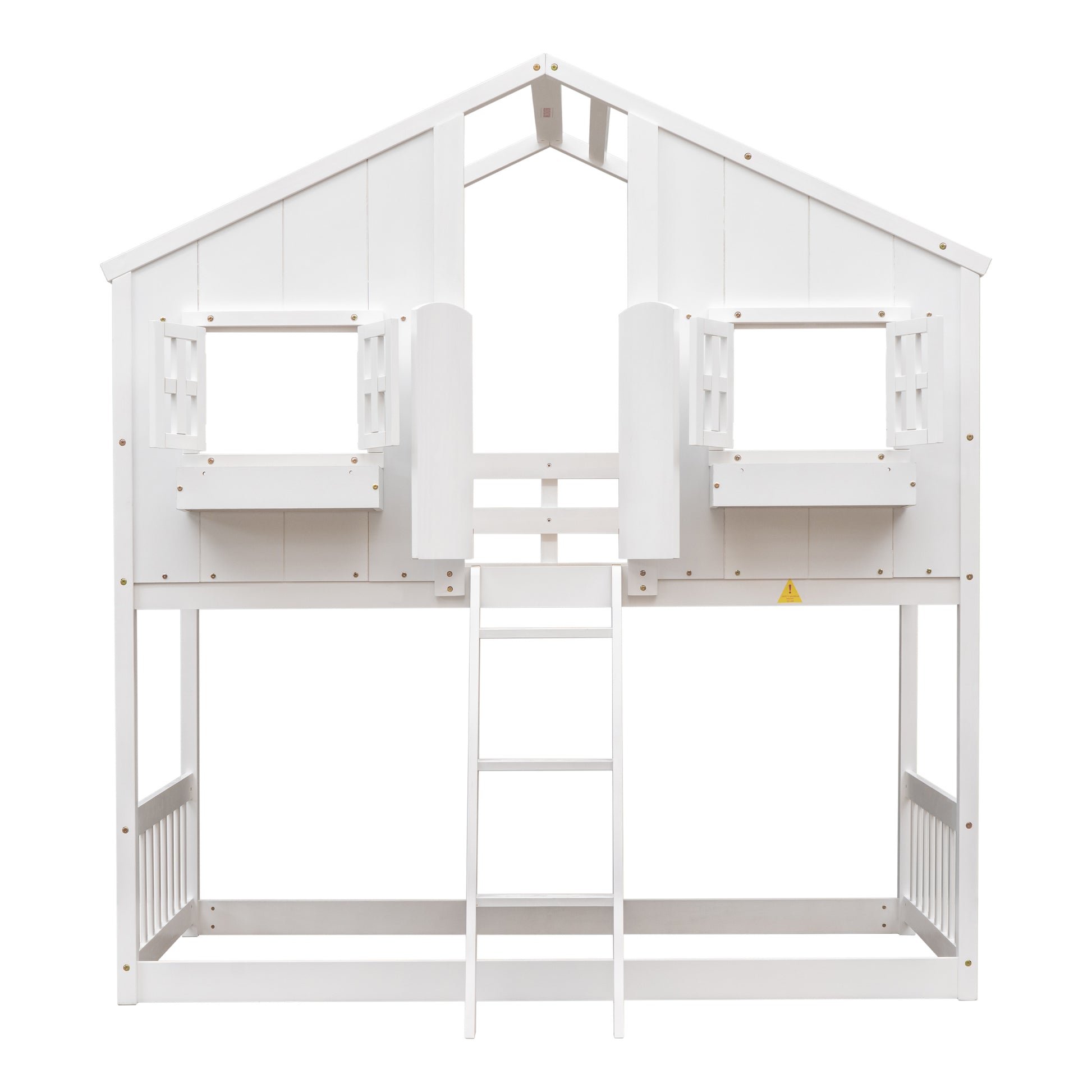 Charming Twin Over Twin House Bunk Bed with Roof and Window Features, Safety Guardrails and Ladder, White