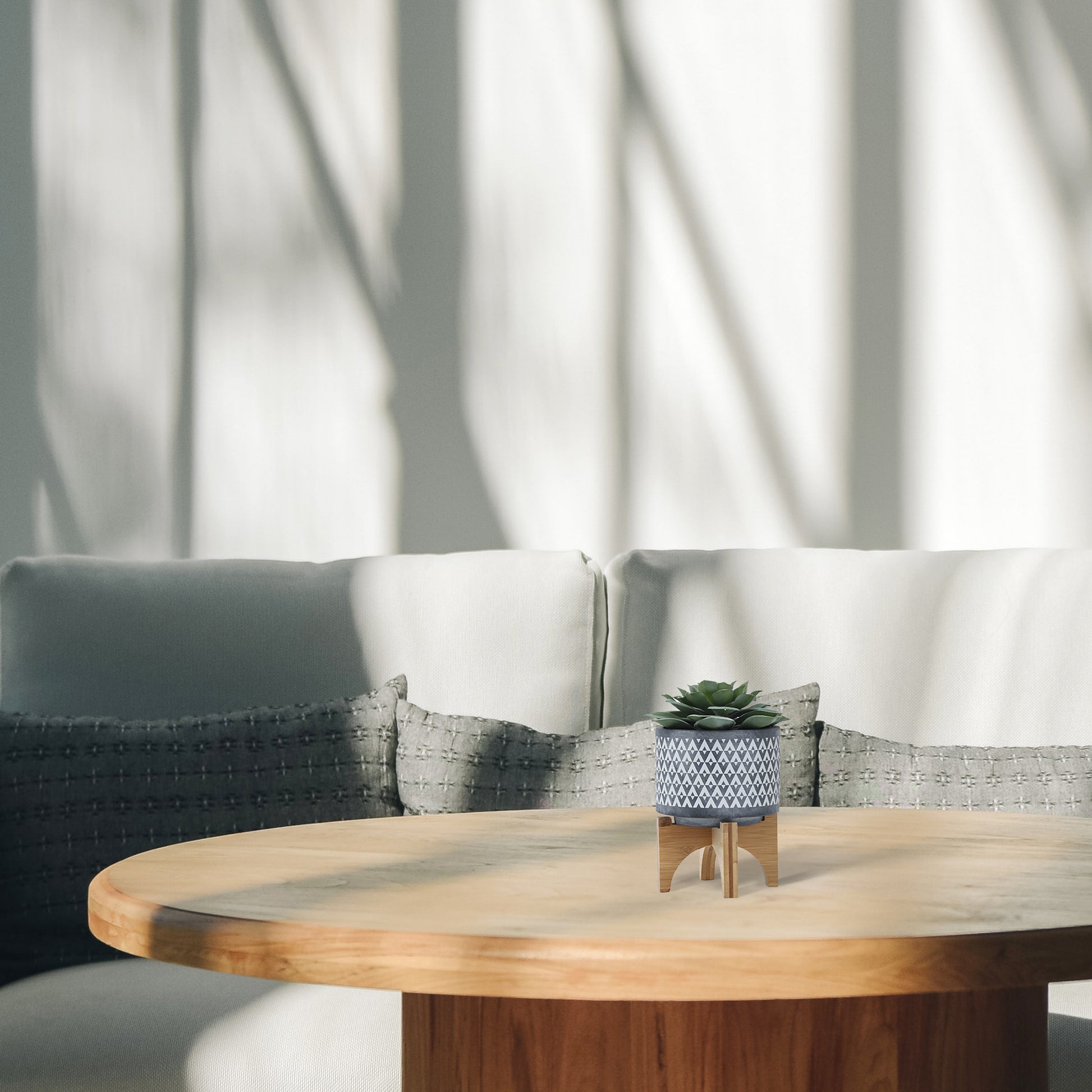 Elevate your space with a modern geometric statement. This Ceramic Aztec Planter sits on a natural wooden stand, blending organic warmth with a sleek gray silhouette. Crafted from durable ceramic, it offers long-lasting quality with an eco-conscious footprint.