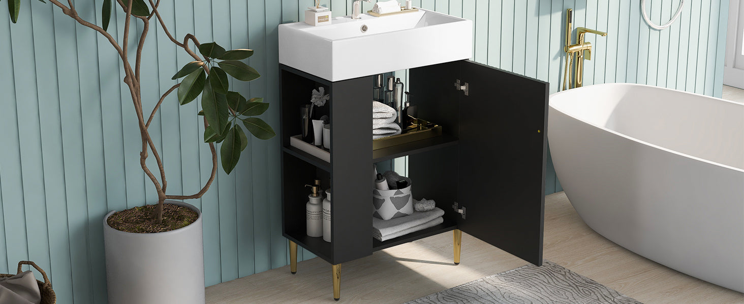 Transform your bathroom into a stylish oasis with the 21.6" Modern Black Bathroom Vanity. This chic vanity combines functionality with contemporary design, featuring a sleek black finish and a high-quality ceramic sink that is both practical and aesthetically pleasing.