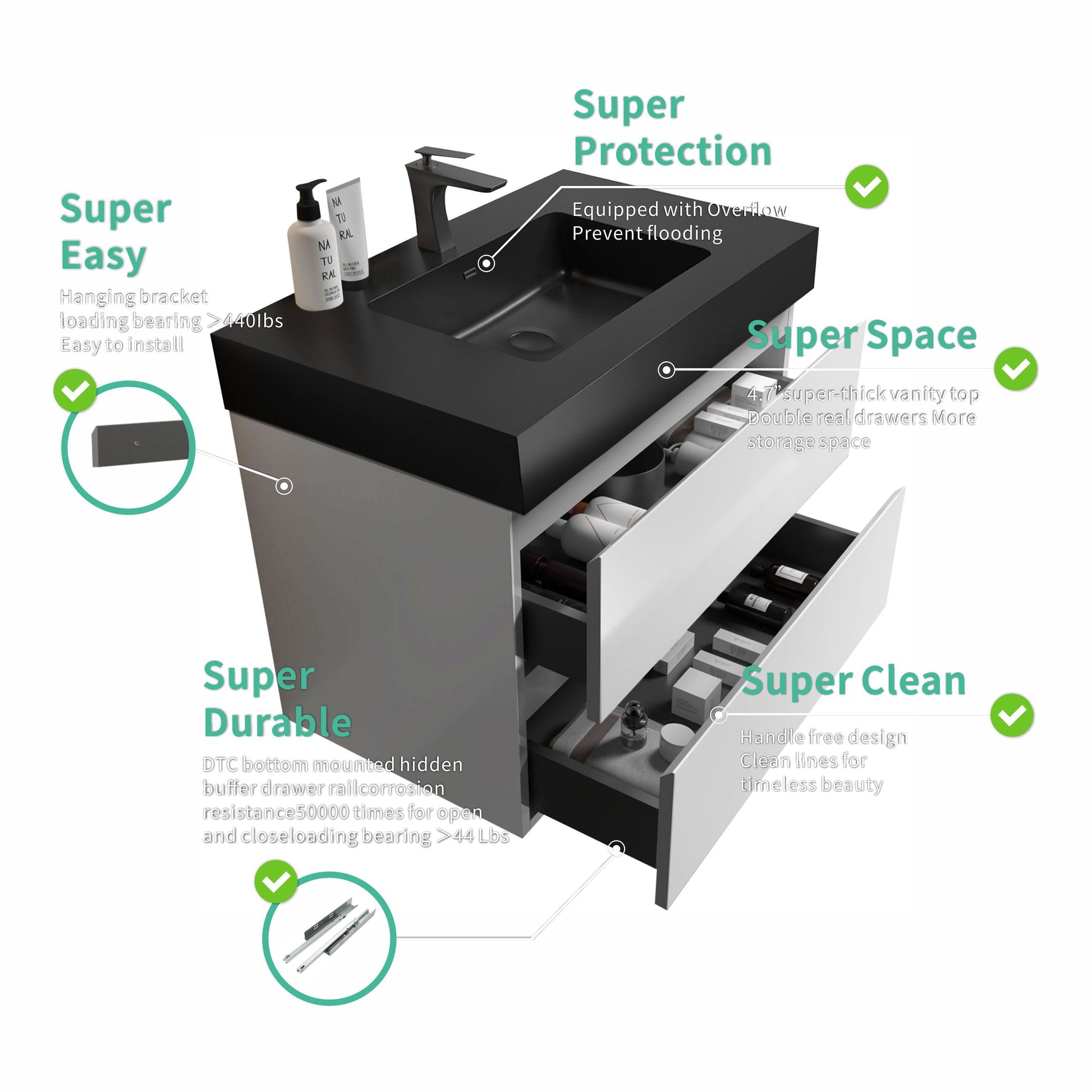 Alice 36" Contemporary White Wall-Mounted Bathroom Vanity with Black Sink Basin, Spacious Storage Solution for Modern Bathrooms, Pre-assembled Design