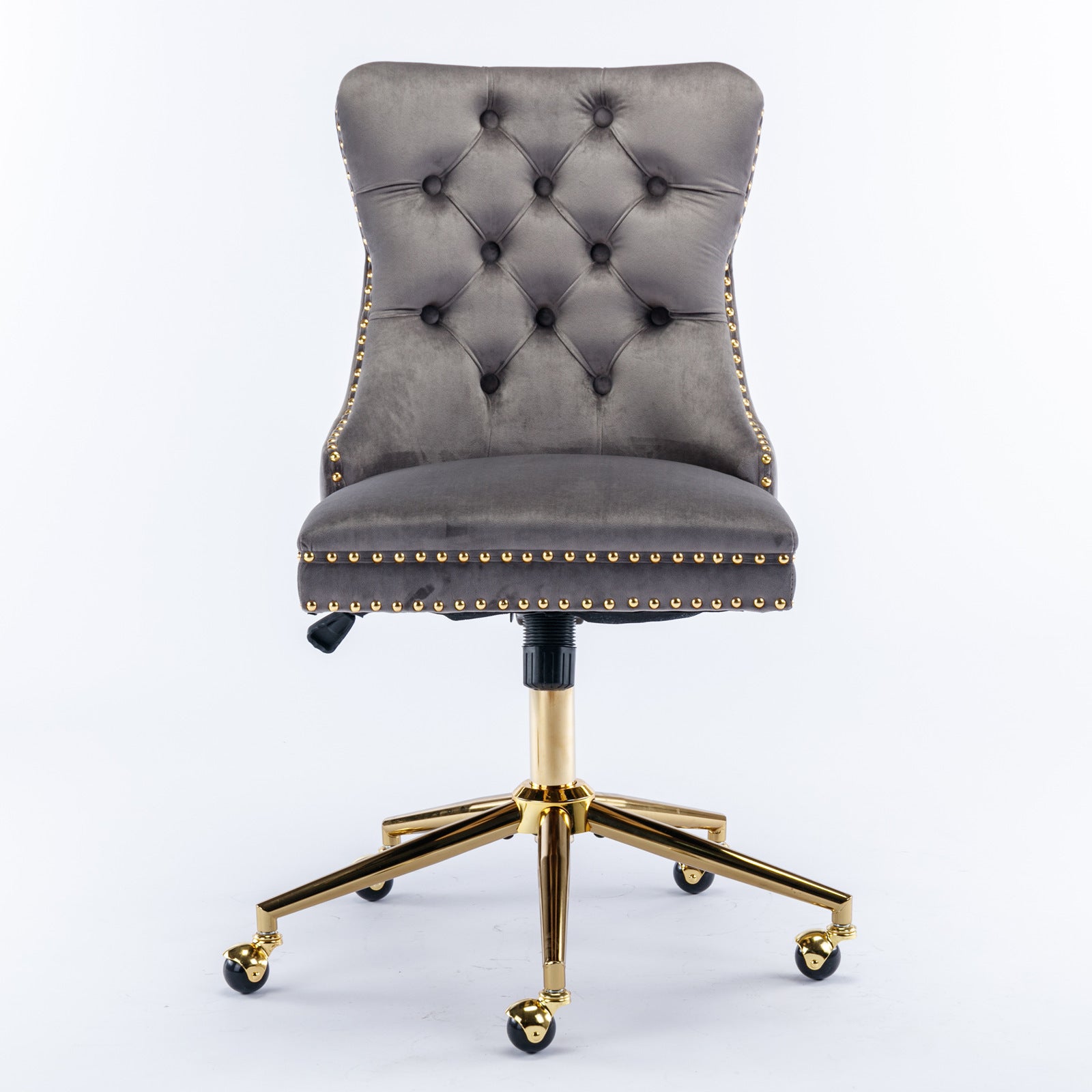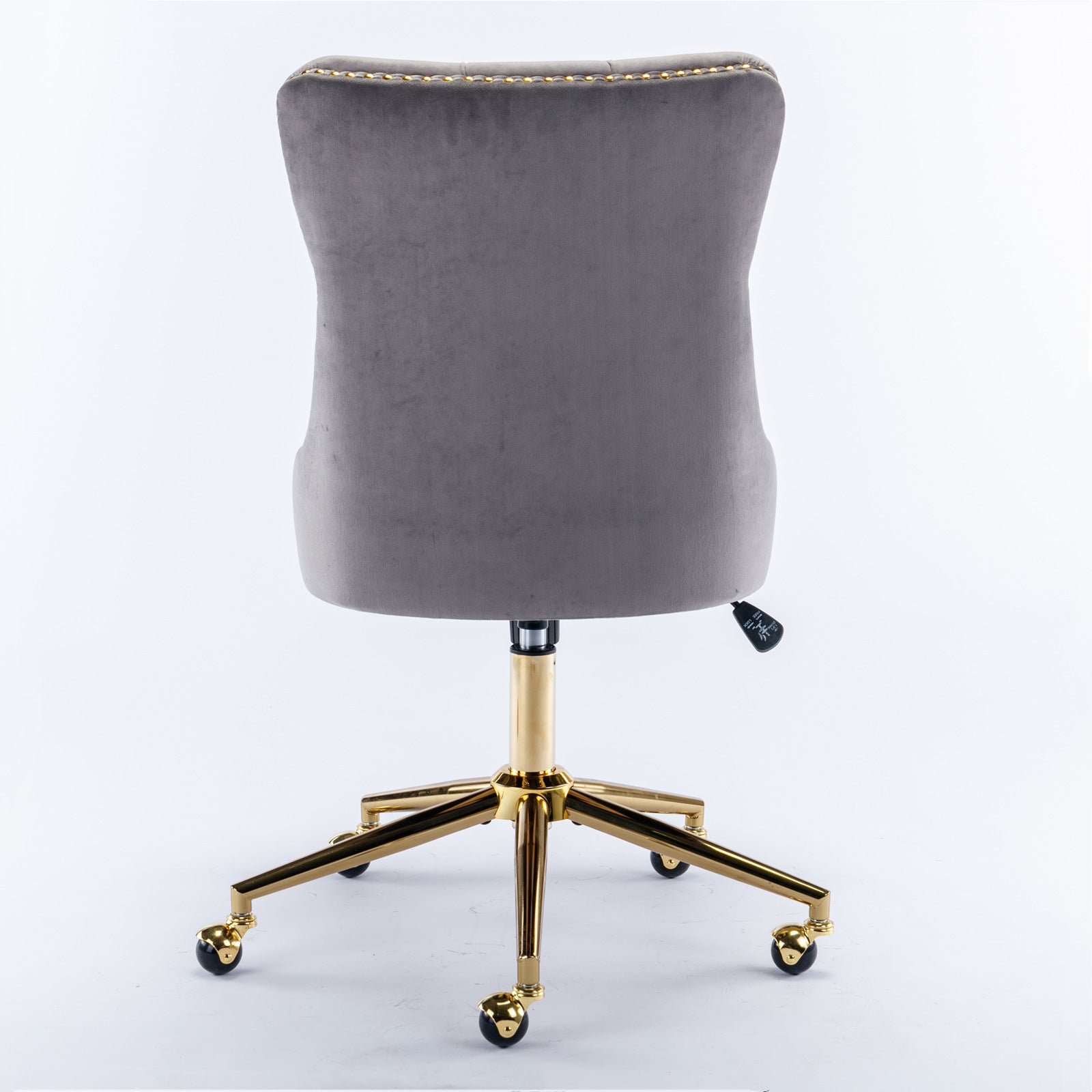 Luxurious Gray Velvet Tufted Home Office Chair with Gold Metal Base, Adjustable Swivel Design