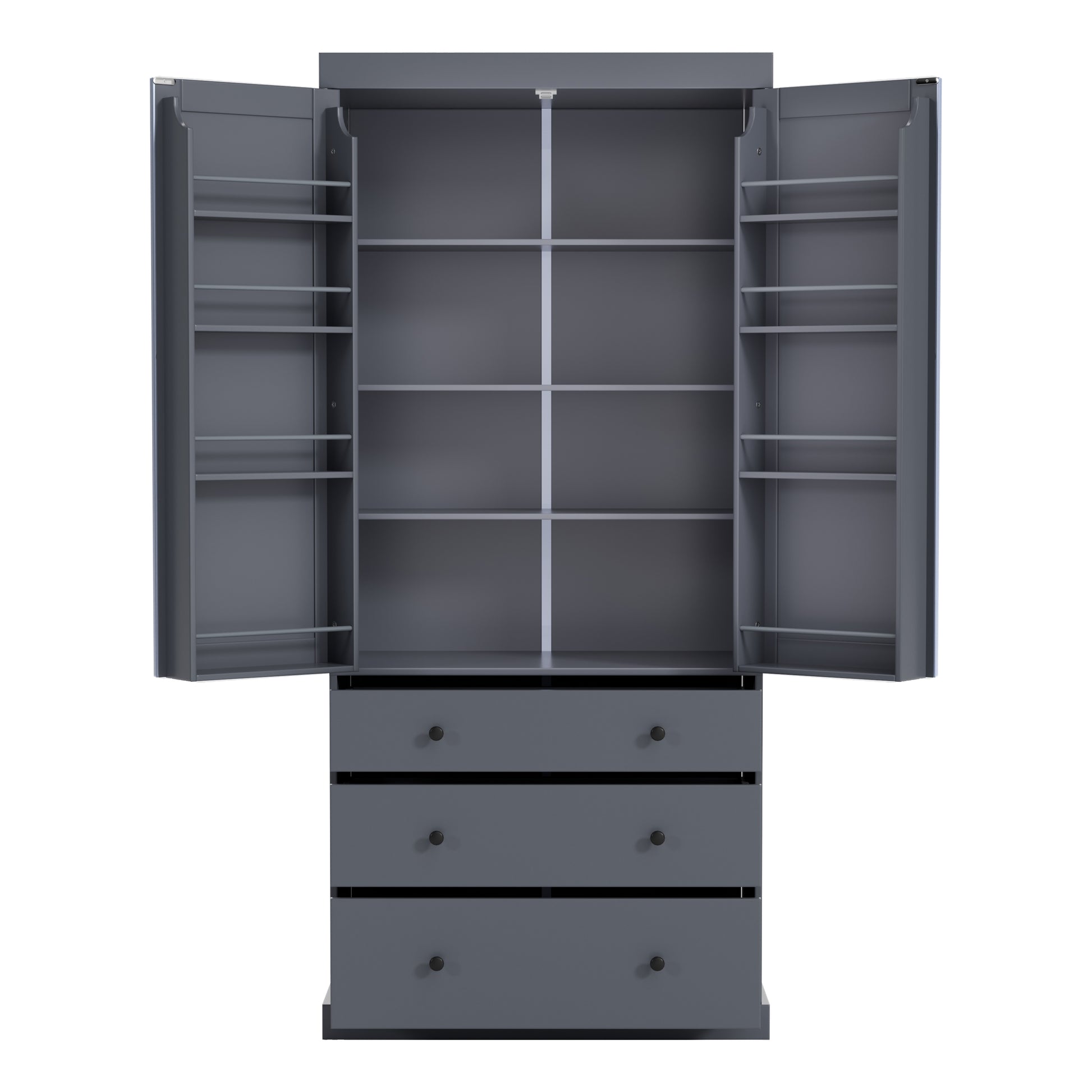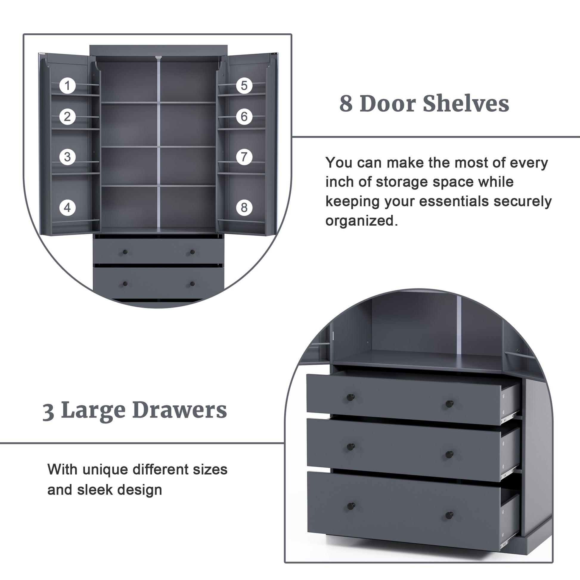 - Innovative Door Shelves: The pantry features 8 door shelves with varying heights and guardrails to ensure your items stay securely in place. Maximize your storage potential while keeping essentials within easy reach.