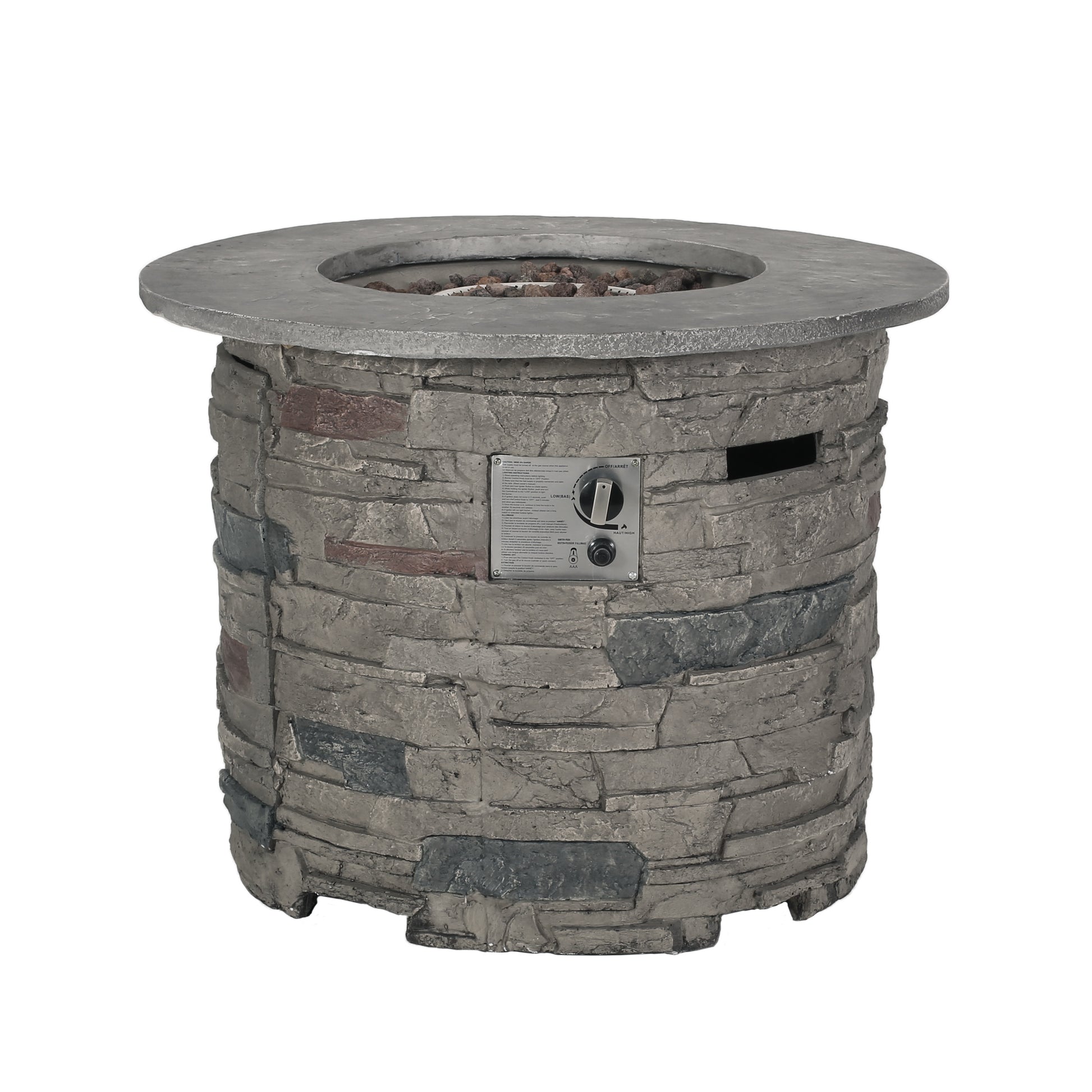 - Modern Transitional Design: A round fire pit table with a stone-gray surface that complements stone, wood, and metal outdoor furniture.