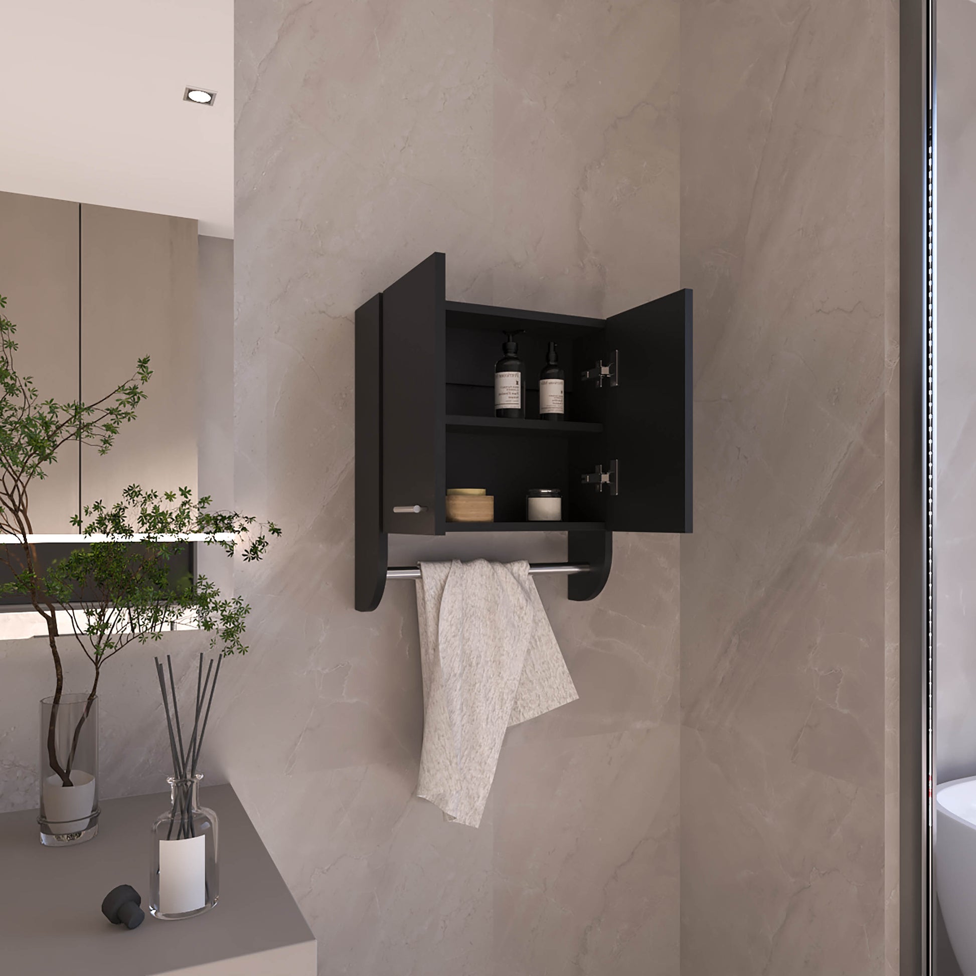 Optim Medicine Cabinet with towel holder 17.4" Wide Medice Cabinet Organizer with Two interior Shelves and Tower Holder for Bathroom, Kitchen, Mudroom