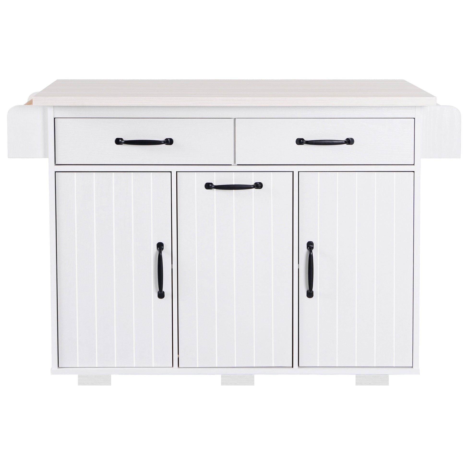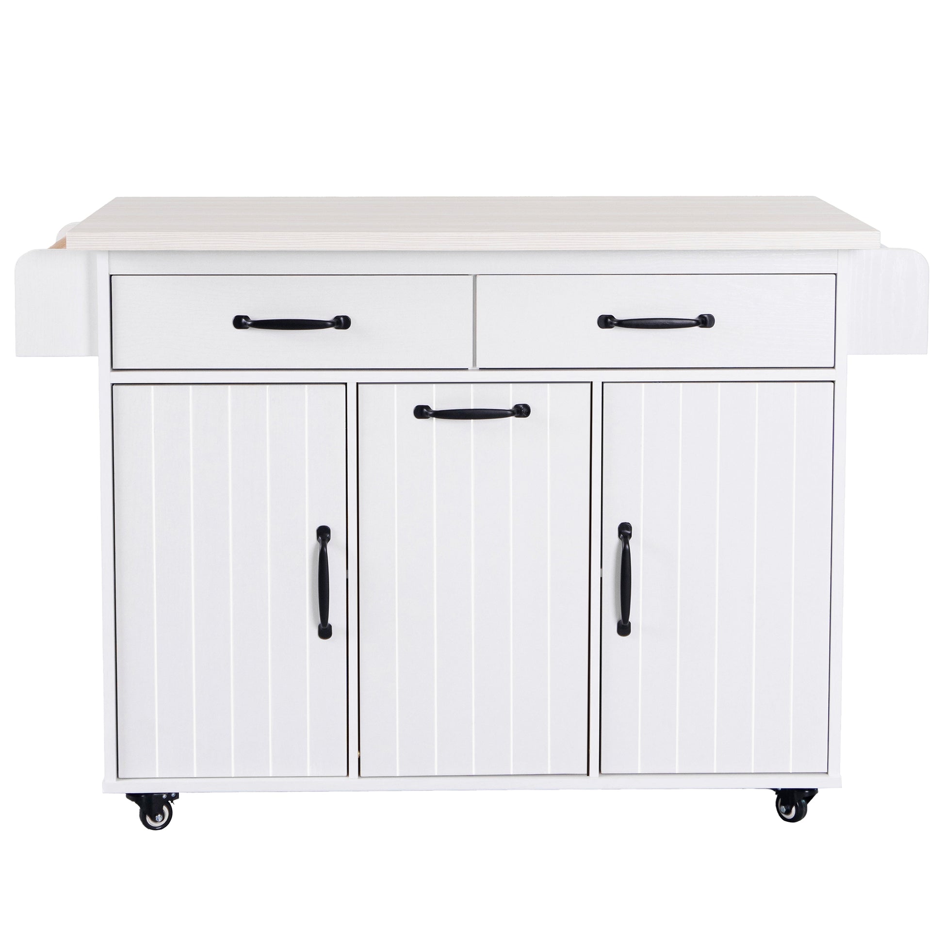 Rolling White Kitchen Island with Drop Leaf and Tilt-out Trash Can Storage, Spice Rack & Towel Rack