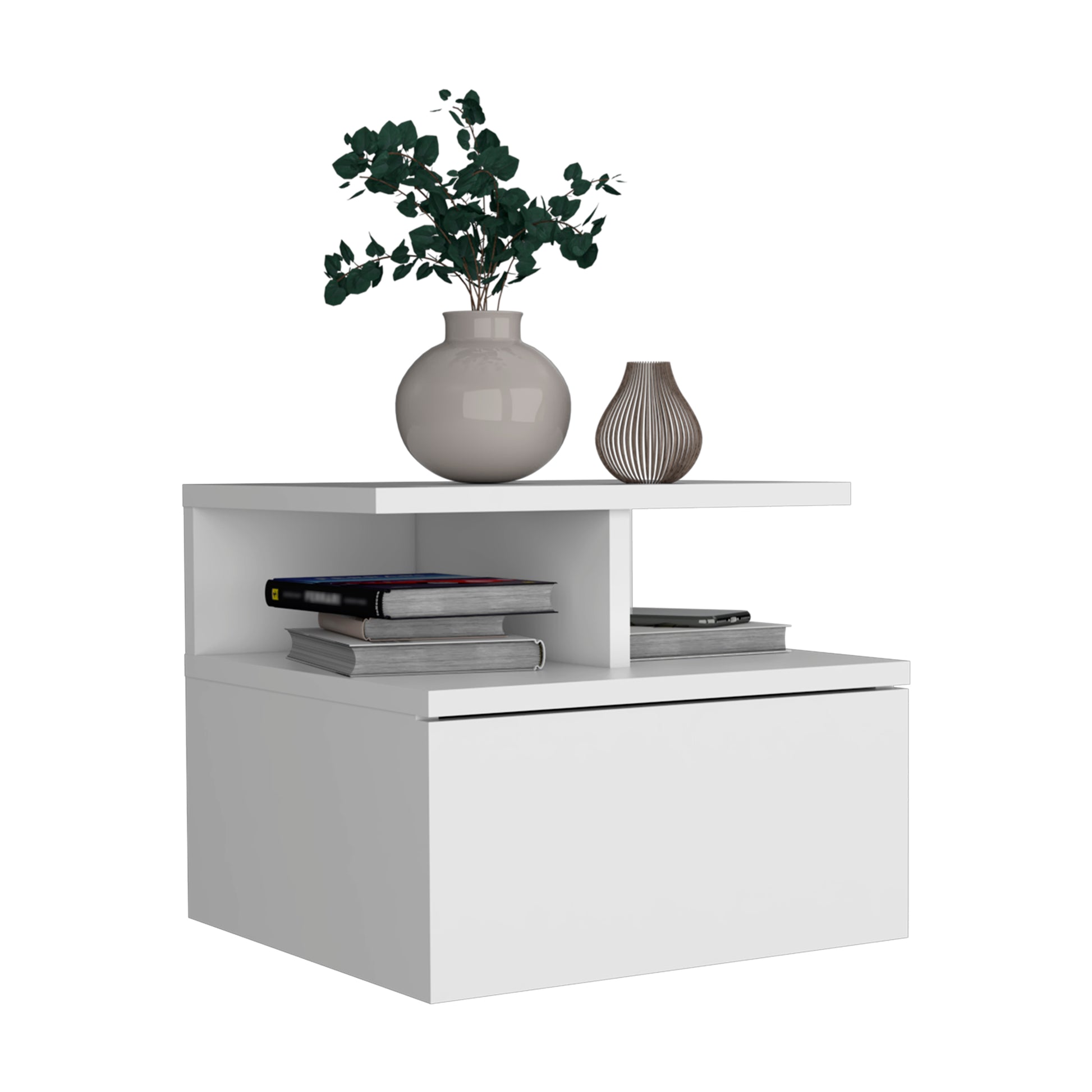 Floating Nightstand 12"H, Wall Mounted with Single Drawer and 2-Tier Shelf, White