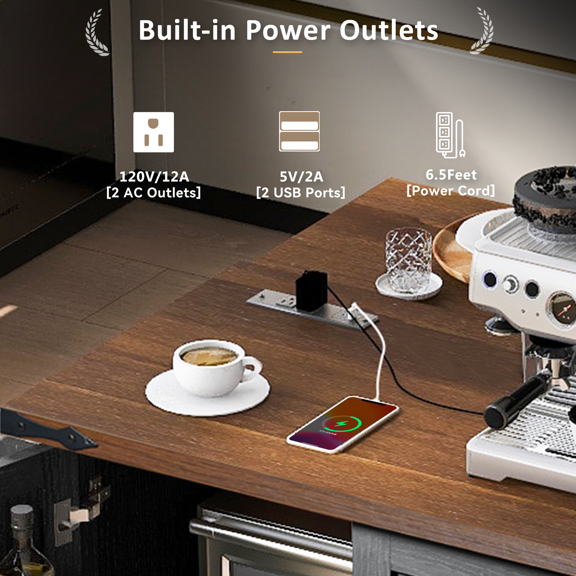 - Built-in Power Supply: Stay connected with a sophisticated charging station equipped with 2 AC outlets and 2 USB ports, perfect for powering your kitchen appliances without the hassle of extension cords.