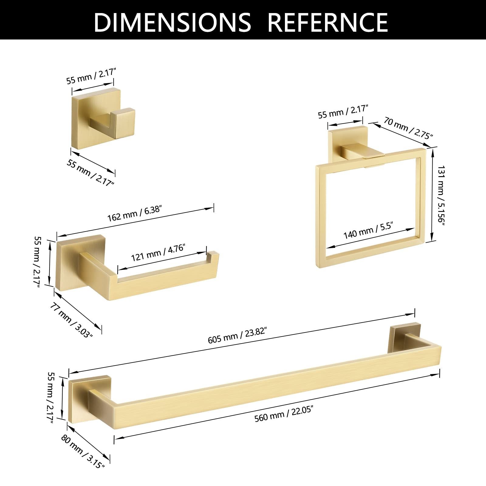 - 5-Pieces Includes: 1 x towel bar, 1 x toilet paper holder, 1 x towel ring, 2 x coat hook.