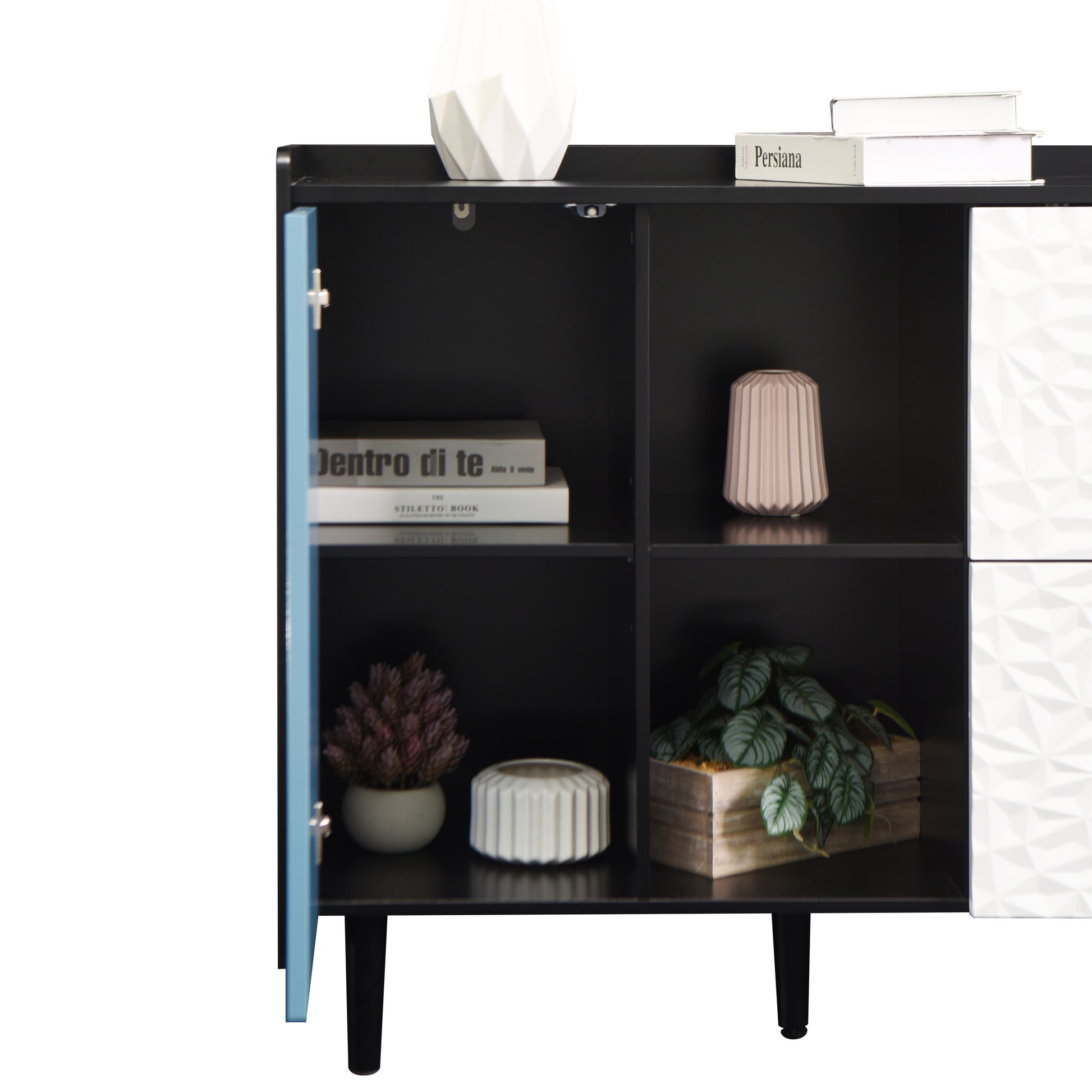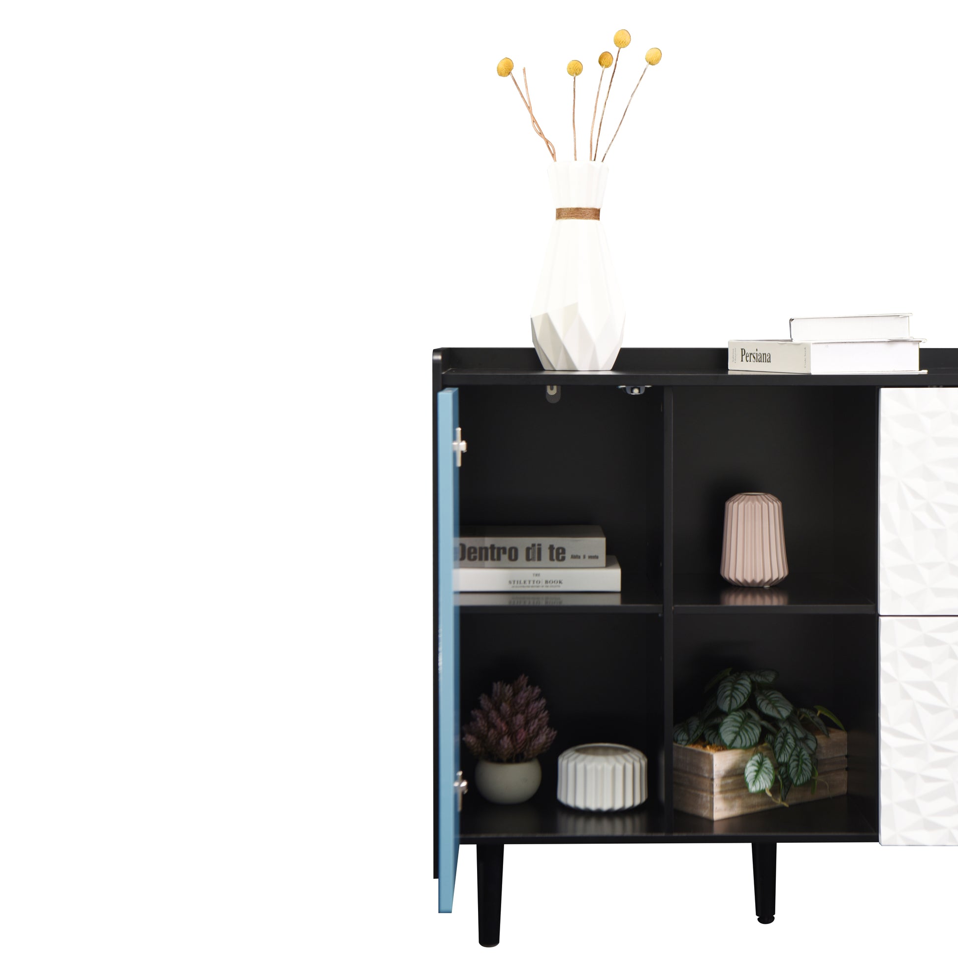Sideboard Buffet Cabinet, Black Storage Cabinet with Red Doors , 2 Drawers with unique panel styling and 2 Open Storage Compartment, Modern Coffee Bar Cabinet Accent Cabinet for Kitchen, Dining Room,