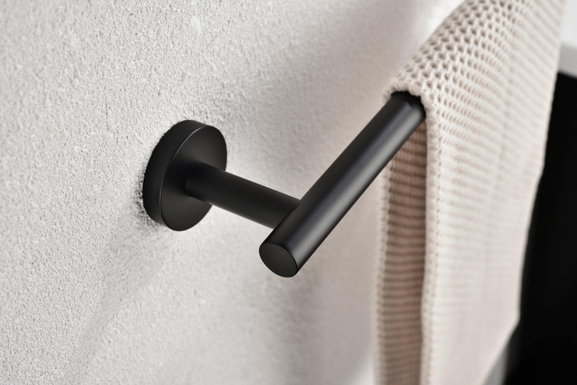- Unique round shape and hidden mounting screws add more modern elements for your room decor, chamfering edges protect your body from scratching. Include 12-inch towel bar, toilet paper holder, robe hook. Easy to install, and mounting hardware included.