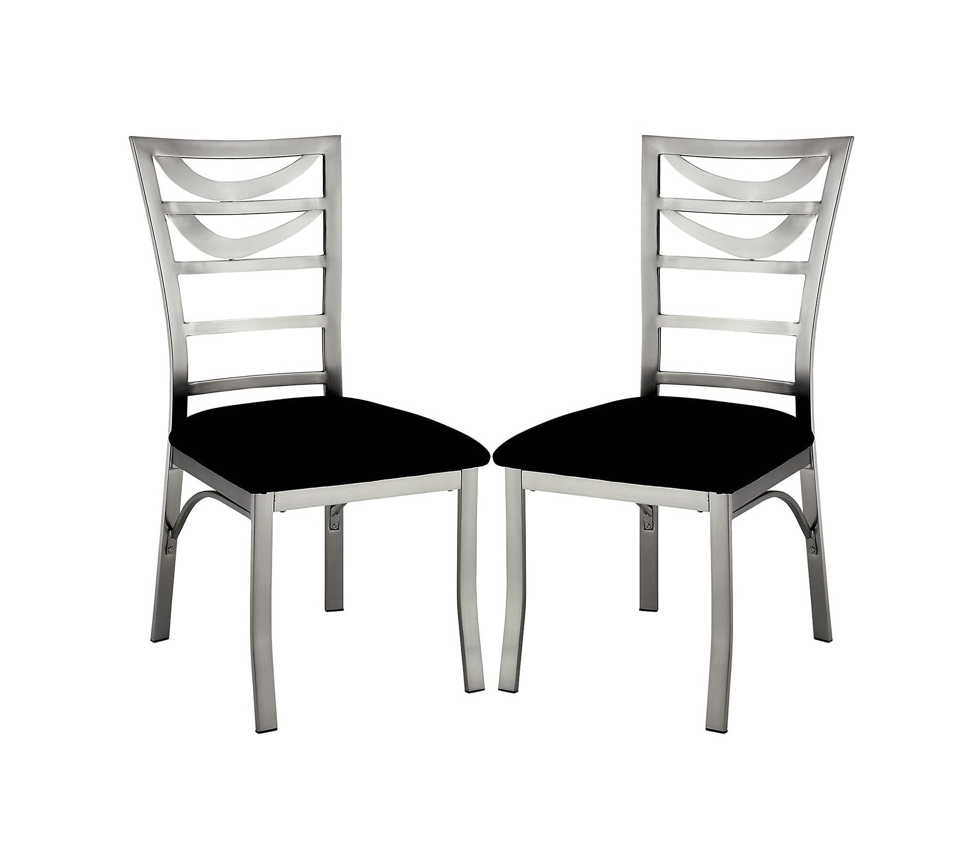 Upgrade your dining space with this 2-piece contemporary metal dining chair set. The ladder-back design pairs with padded microfiber seats to deliver a perfect blend of comfort and modern style for dining rooms, kitchens, or casual dining nooks. Built with a durable metal frame and a satin-plated powder coating, these chairs offer a sleek black finish with silver-toned accents that complement a variety of decors.